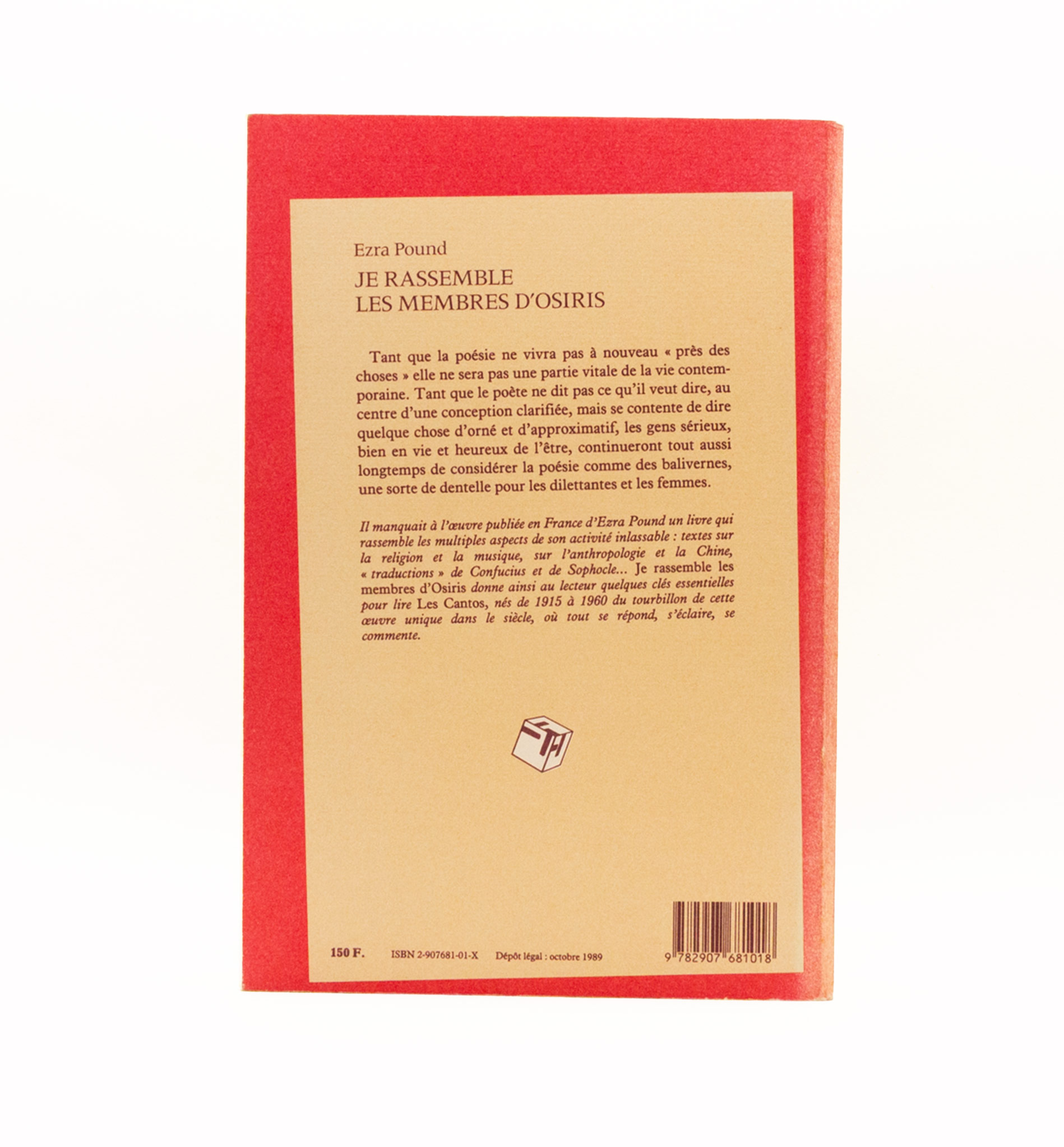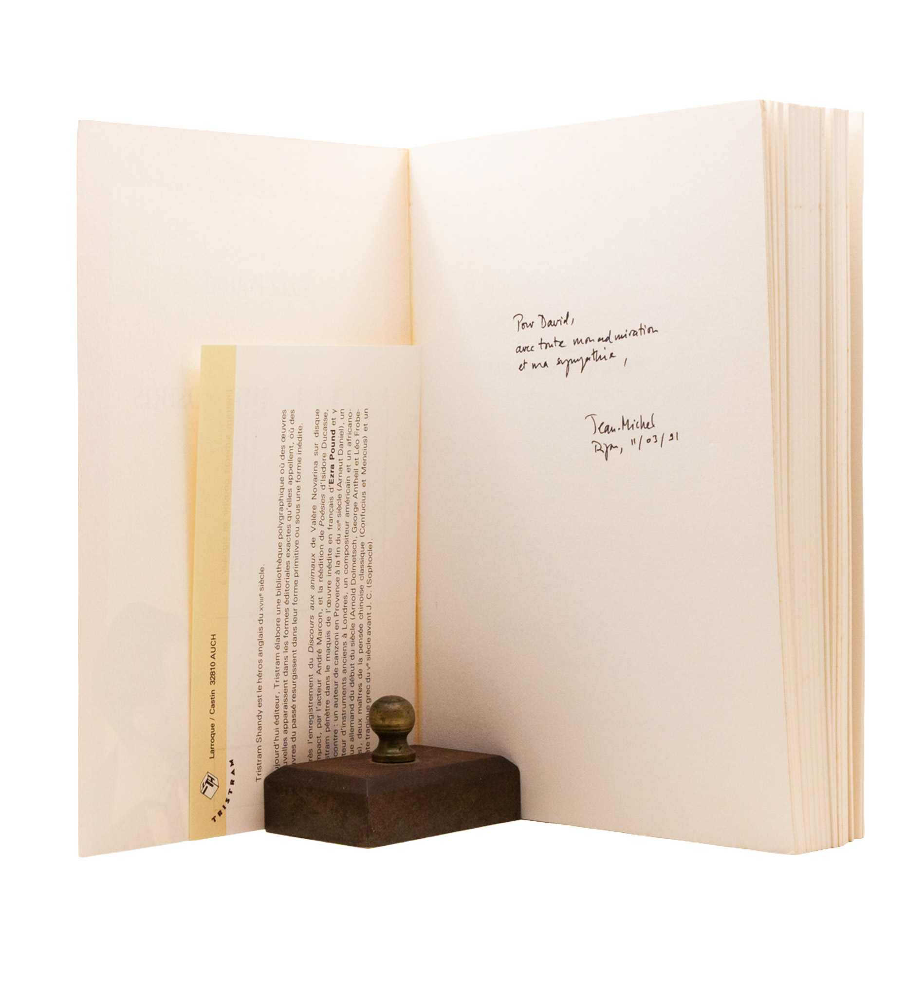 First French translation of Pound’s essay, I Gather the Limbs of Osiris, containing Pound’s early scholarly method, Luminous Detail, first appearing in the New Age, Nov. 1911 to Feb. 1912. Inscribed to A. David Moody by Jean-Michel Rabaté on the ffep, dated Dijon, March 1991. With David Moody’s occasional pencil inscription and a handwritten note laid in. A further postcard announcement laid-in from the publisher. Some light sunning at edge of spine, and a light crease to spine. Too late for Gallup.