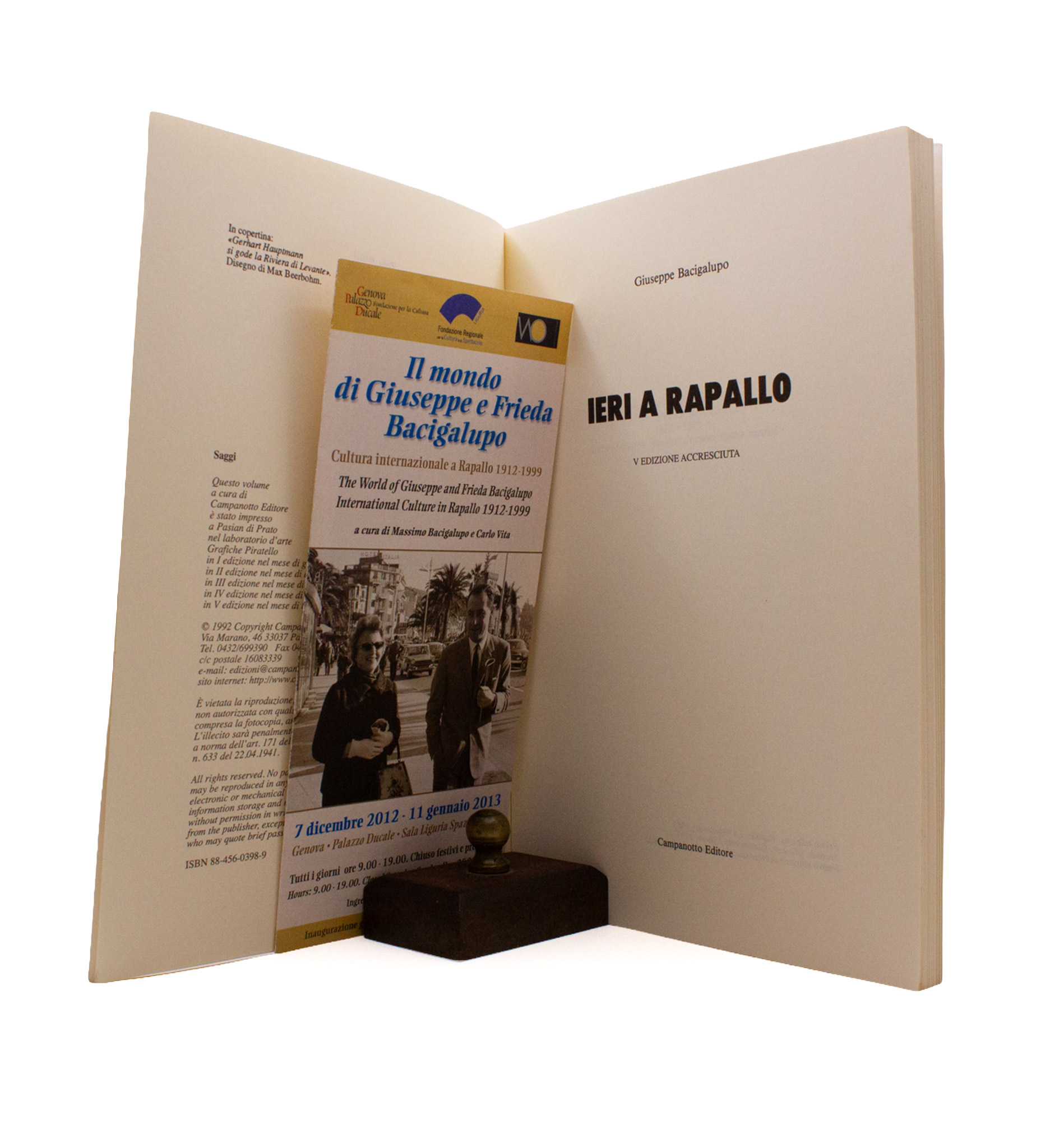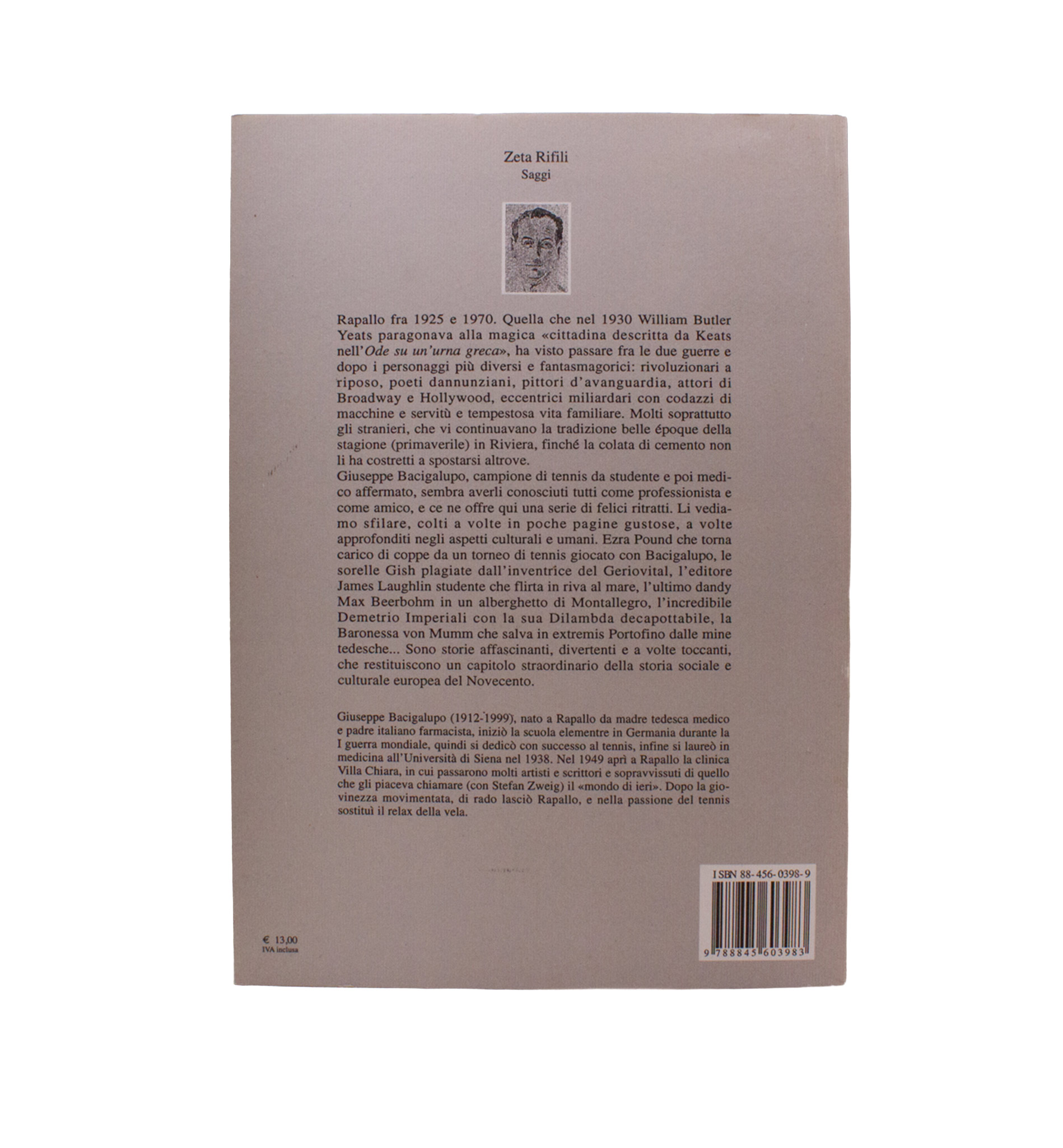 Bacigalupo, a tennis champion in his youth, an accomplished doctor, and a local Rapallese describes the many (mostly) foreigners who gravitated to the coastal town, including EP as tennis champion in his own right, and James Laughlin flirting by the sea. The chapter on EP annotated in the margin by David Moody. With an exhibition leaflet, Il mondo di Giuseppe e Frieda Bacigalupo, Cultura internazionale a Rapallo 1912-1999 a cura di Massimo Bacigalupo e Carlo Vita, 7 dicembre 2012 - 11 gennaio 2013 laid in.