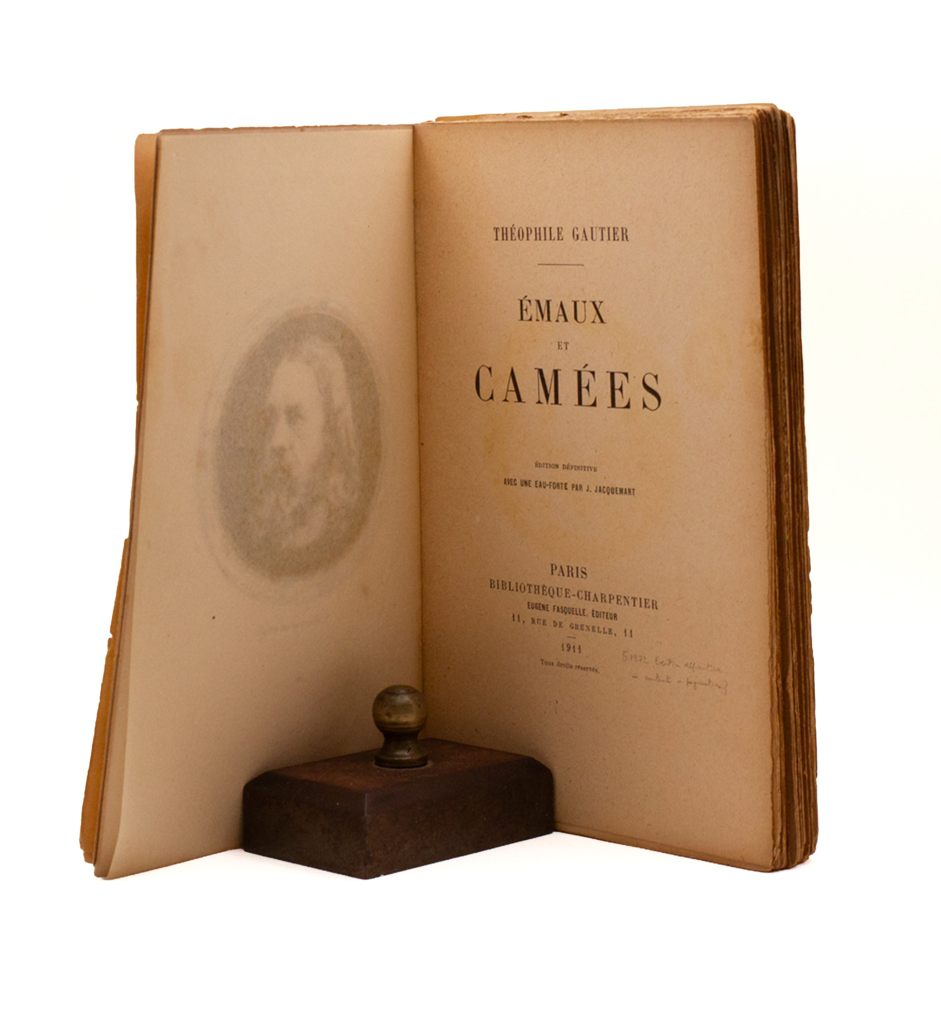 A later edition of the Édition Définitive (first in 1872) which carries this eau-forte by J. Jacquemart. With a note in pencil by A.D.M. to the title page to this effect. Lacking the front cover; some loss to the paper covering the spine, but sound. In a paper envelope with a note in ink referencing “Mauberley 1920.”