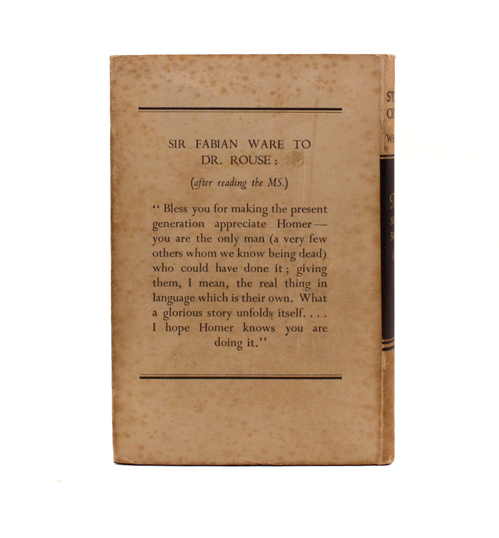 Rouse’s modern prose translation of Homer’s Odyssey. First edition. A fine copy in a faded and spotted dust-jacket with a little edge-wear. Contemporary ink gift inscription to ffep. A number of contemporary newspaper clippings laid-in to the front and back of this book, each relating to either this translation, Rouse’s Story of Achilles, or other Homeric publications.