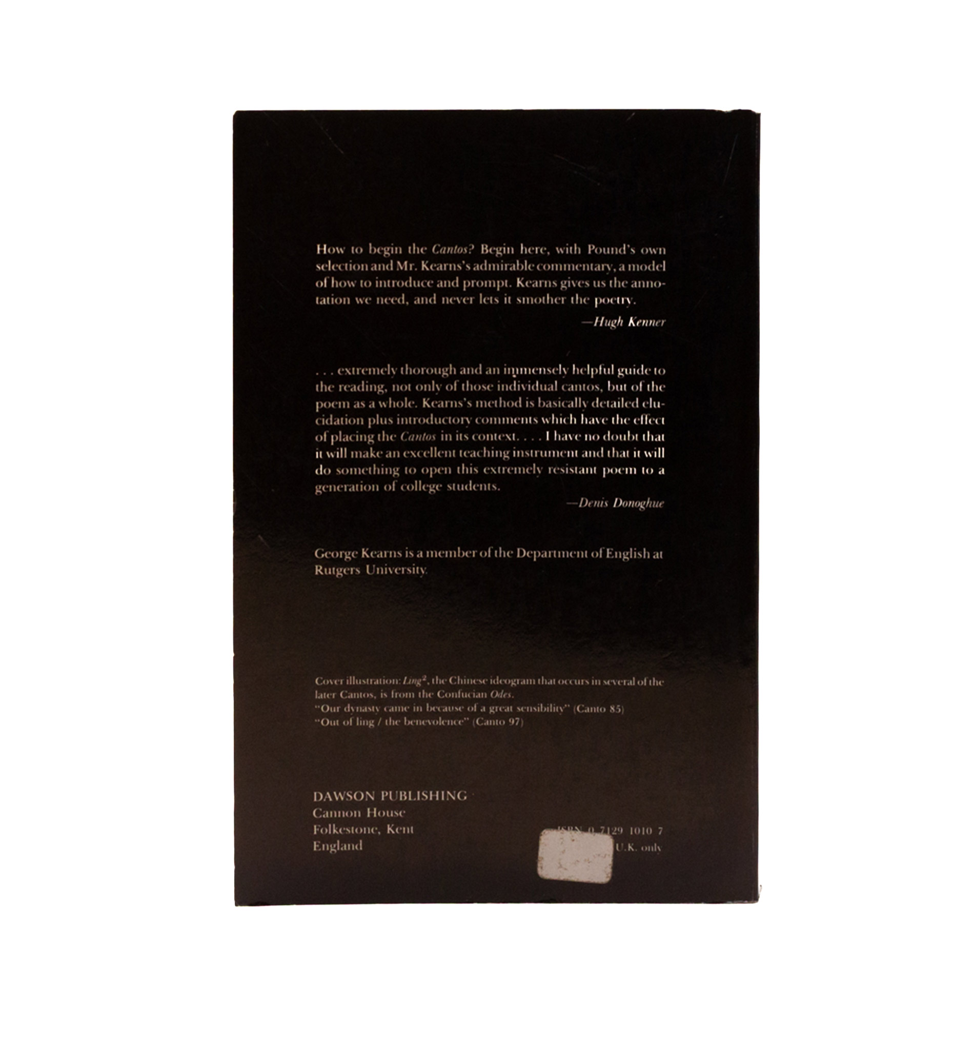 The second gloss to The Cantos, building on Edward & Vasse’s and published just before Terrell’s. Not, for the most part, annotations, but instead short essays on meanings and contexts. First edition, a very good copy, the front cover lifting slightly, top and tail of spine lightly bumped. Fleetingly annotated by A. David Moody.