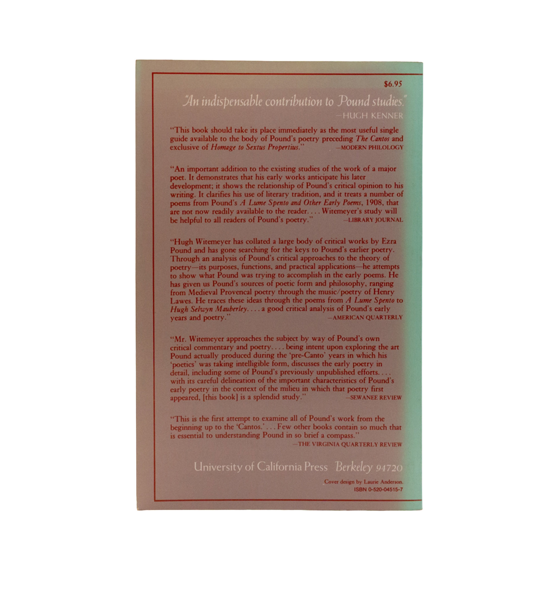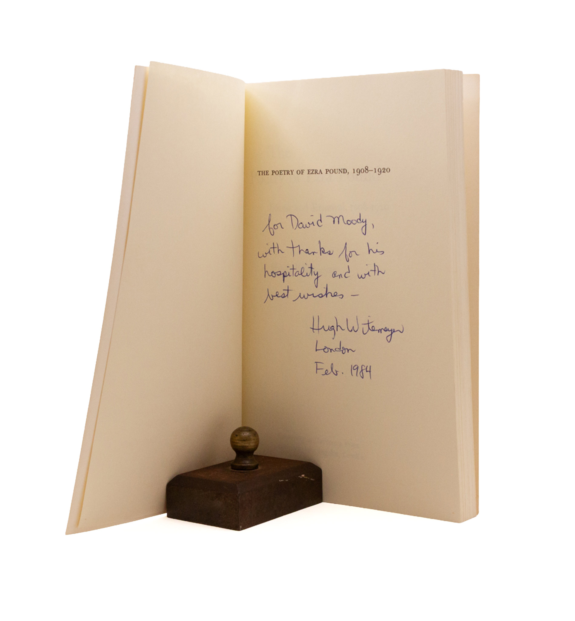 “Indispendable,” in Kenner’s words. A study of Pound’s poetry from ALS to HSM, including pieces unpublished. Inscribed to David Moody on the half-title, “with thanks for his hospitality,” dated 1984. The usual noughts and crosses in the margin from David Moody. First paperback edition after the 1969 first. Spine sunned from grey to green, touch of damage at top of spine, front cover lifting; with the occasional pencil from David Moody.