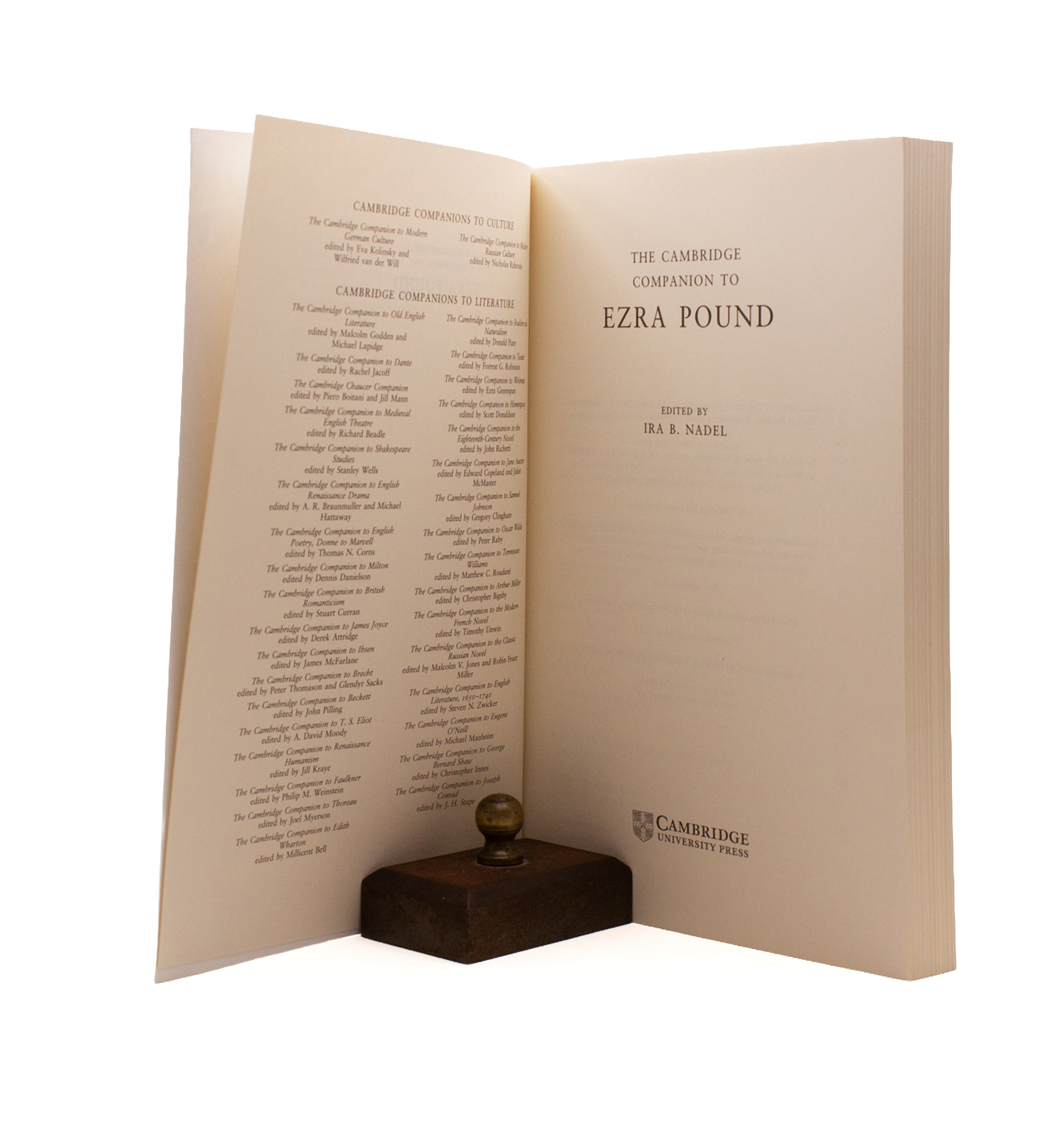 “This Cambridge Companion to Ezra Pound contains fifteen chapters by leading international scholars, who together reflect diverse but complementary approaches to the study of Ezra Pound’s poetry and prose. They consider the poetics, foreign influences, economics, politics and publication history of Pound’s entire corpus [!], and reveal his importance in developing some of the key movements in twentieth-century poetry. The book also situates Pound’s work in the context of modernism, illustrating his influence on contemporaries such as T. S. Eliot and James Joyce. Taken together, the chapters offer a sustained examination of one of the most versatile, influential and certainly controversial poets of the modern period.” First edition, paperback issue. A fine copy save the slightest edge wear to the back wrap. With the occasional pencil marginalia from David Moody, including lots of disagreement with Nadel’s Chronology.