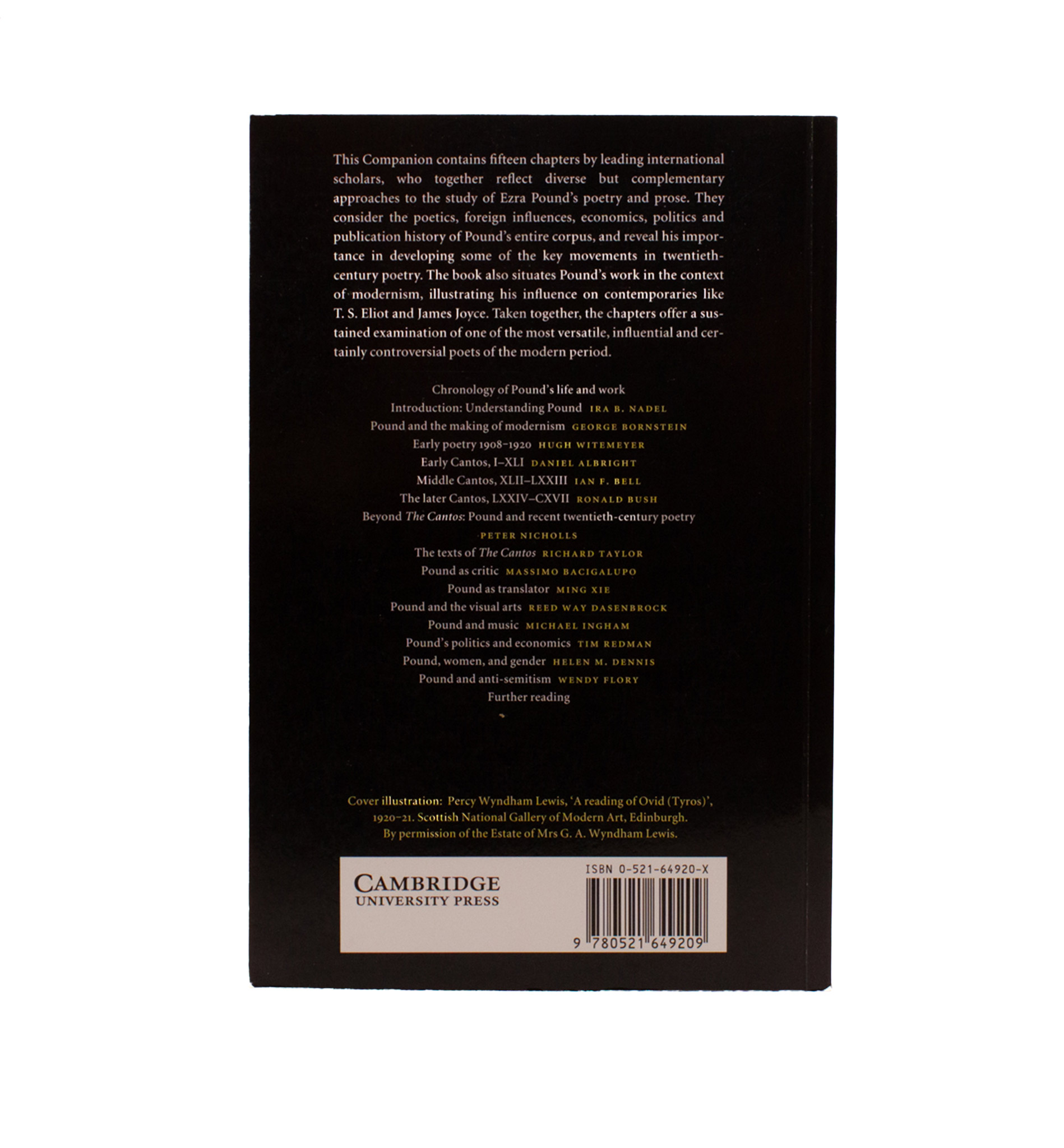 Contents: Ira B. Nadel, “Introduction Understanding Pound”; George Bornstein, “Pound and the making of modernism”; Hugh Witemeyer , “Early poetry 1908-1920”; Daniel Albright, “Early Cantos I-XLI”; Ian F. A. Bell, “Middle Cantos XLII-LXXI”; Ronald Bush, “Late Cantos LXXII-CXVII”; Peter Nicholls, “Beyond The Cantos: Pound and American poetry”; Richard [Dean] Taylor, “The texts of The Cantos”; Massimo Bacigalupo, “Pound as critic”; Ming Xie, “Pound as translator”; Reed Way Dasenbrock, “Pound and the visual arts”; Michael Ingham, “Pound and music”; Tim Redman, “Pound’s politics and economics”; Helen M. Dennis, “Pound, women and gender”; Wendy Flory, “Pound and antisemitism.”