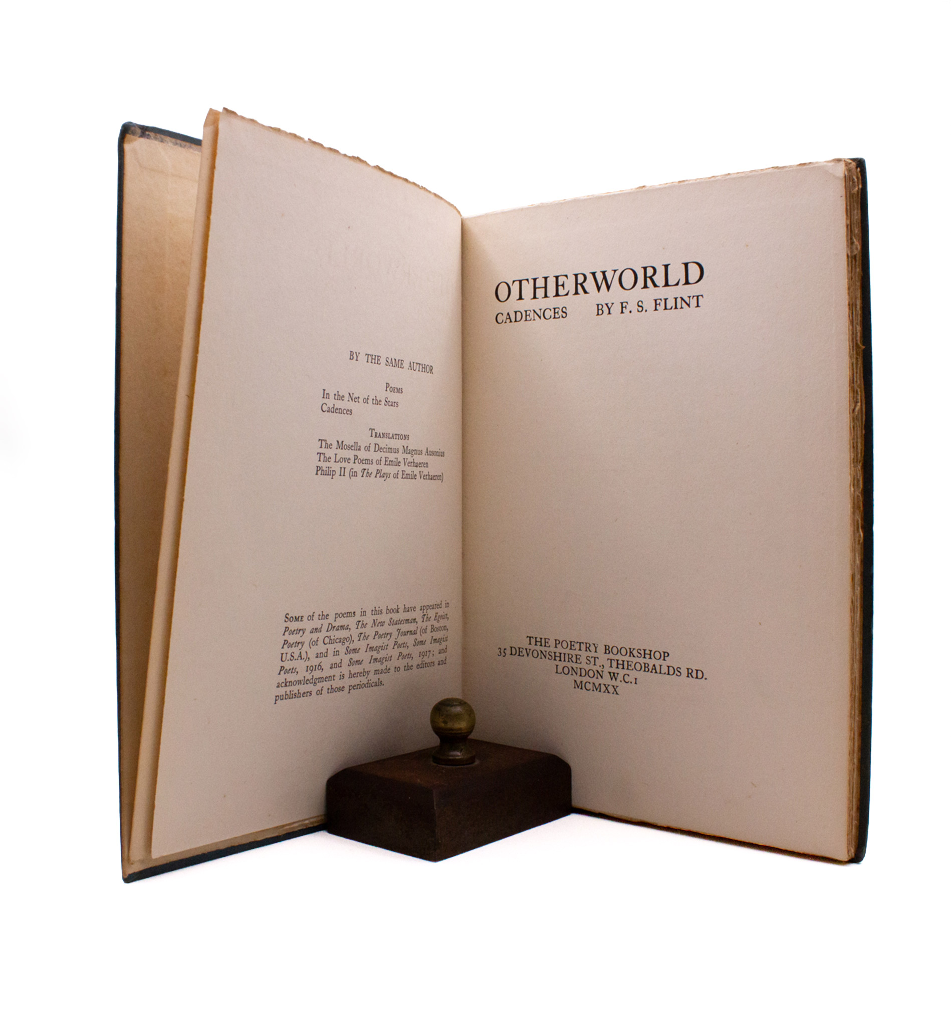 First edition, no. 106 of 500 copies (the first 25 on Japon). With a frontispiece portrait of the author by Polia Chentoff, printed by Martin Kaelin. Letter Press by Imprimerie Crété, “both of Montparnasse.” Beautifully clean throughout, with ten small pencil scores highlighting poems on the contents page, and slight printer’s shadow to the poem of p.11, Drowned. One section (from frontis to p.12) loosened off spine without damage. Front gutter cracked, the binding remaining sound. Boards lightly rubbed. Paper label on spine complete if a little rubbed. Again, I find no bibliographical records, and very little scholarship.