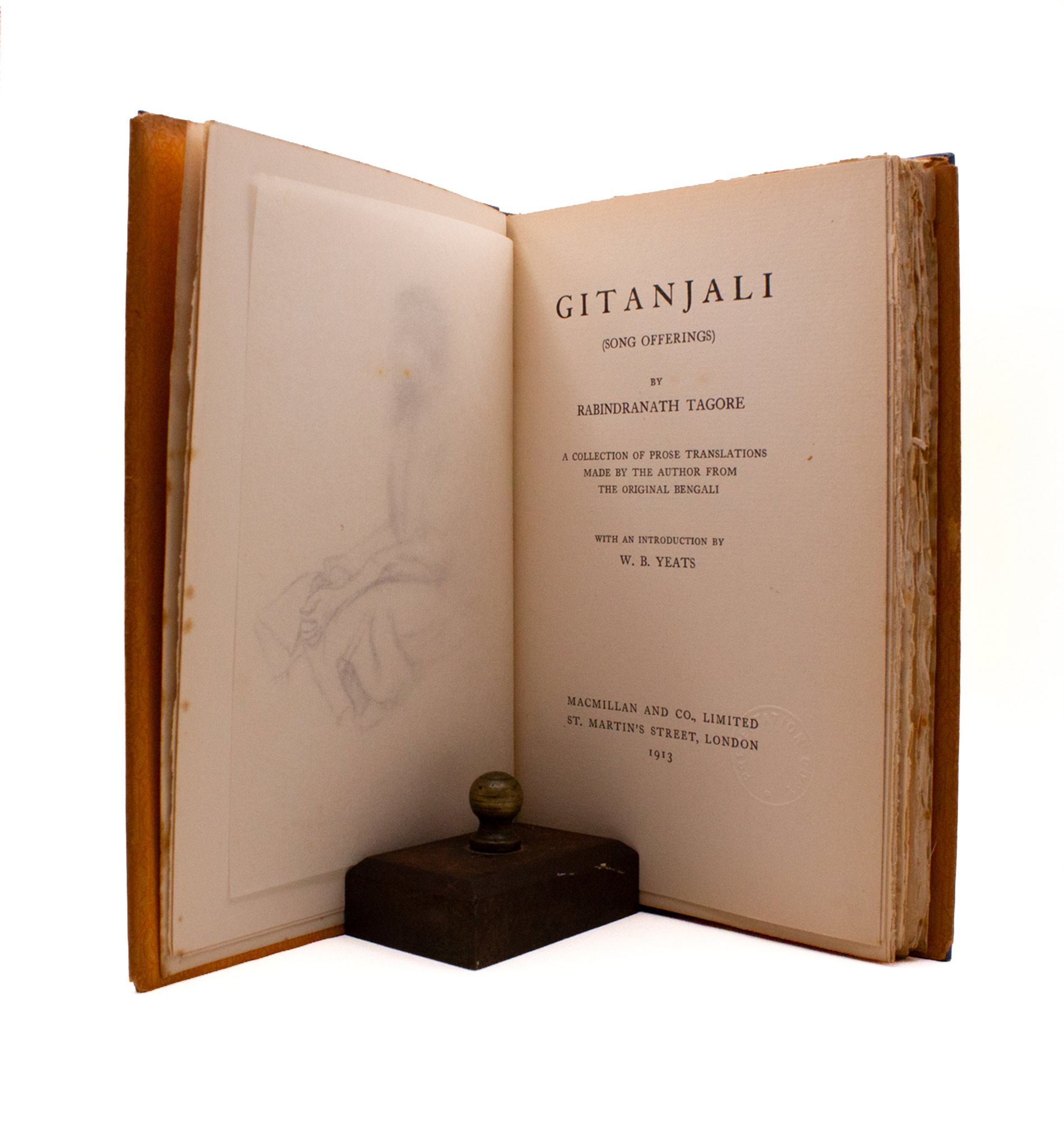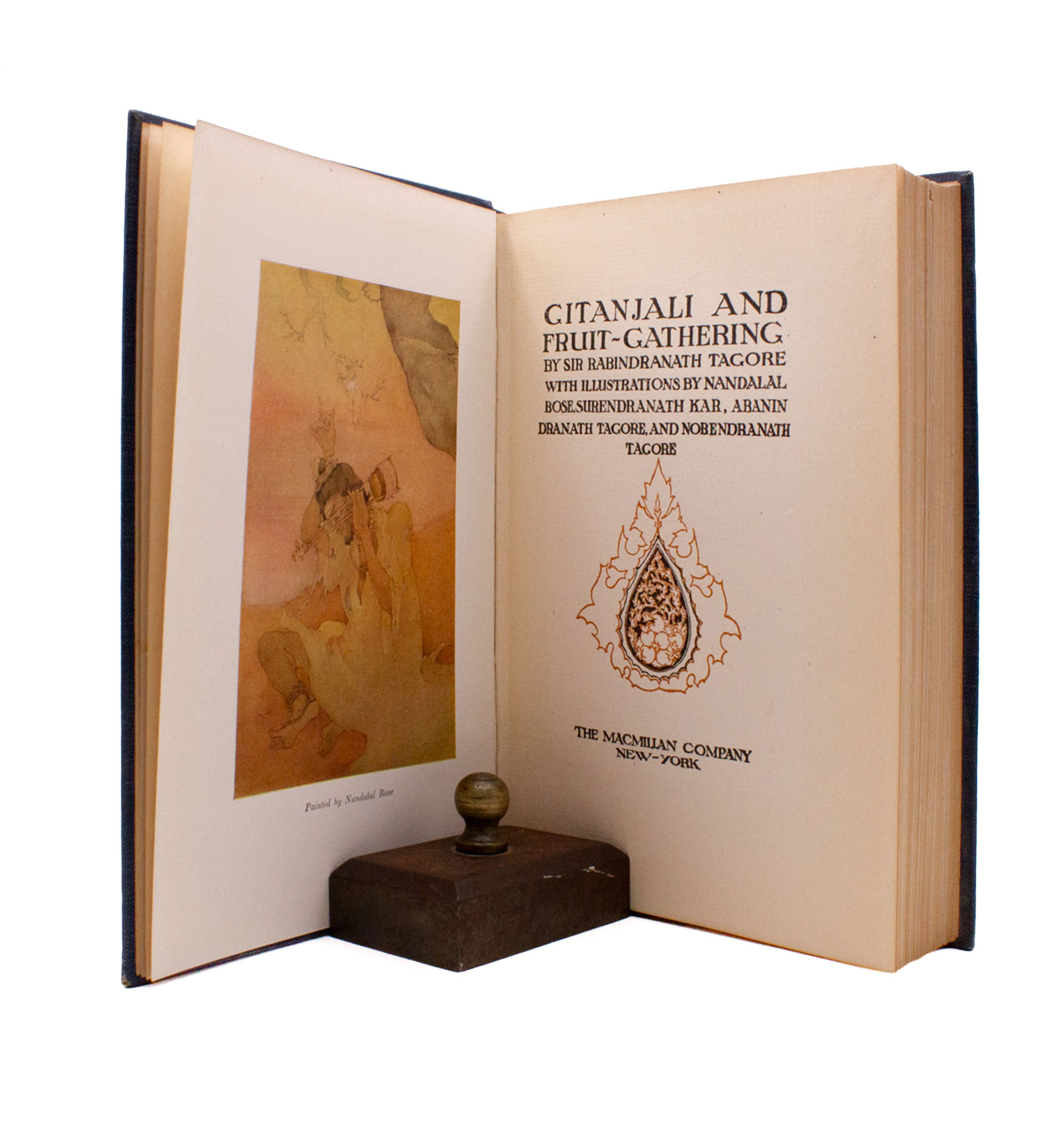 First edition, with the publisher’s circular “Presentation Copy” crimp to title page. From the library of W. H. Livens, military inventor and spiritualist, with his pencil ownership inscription to ffep. Original cloth with design by Thomas Sturge Moore, who had copies of Tagore’s original manuscripts and helped with revisions; light rubbing around corners and fading to spine, but largely a fine copy.