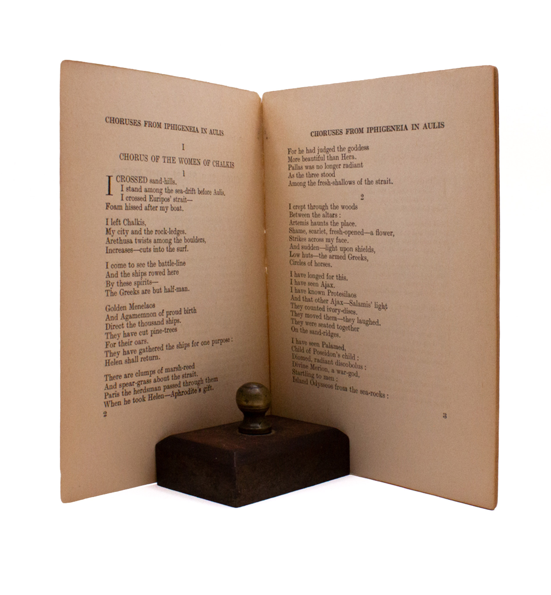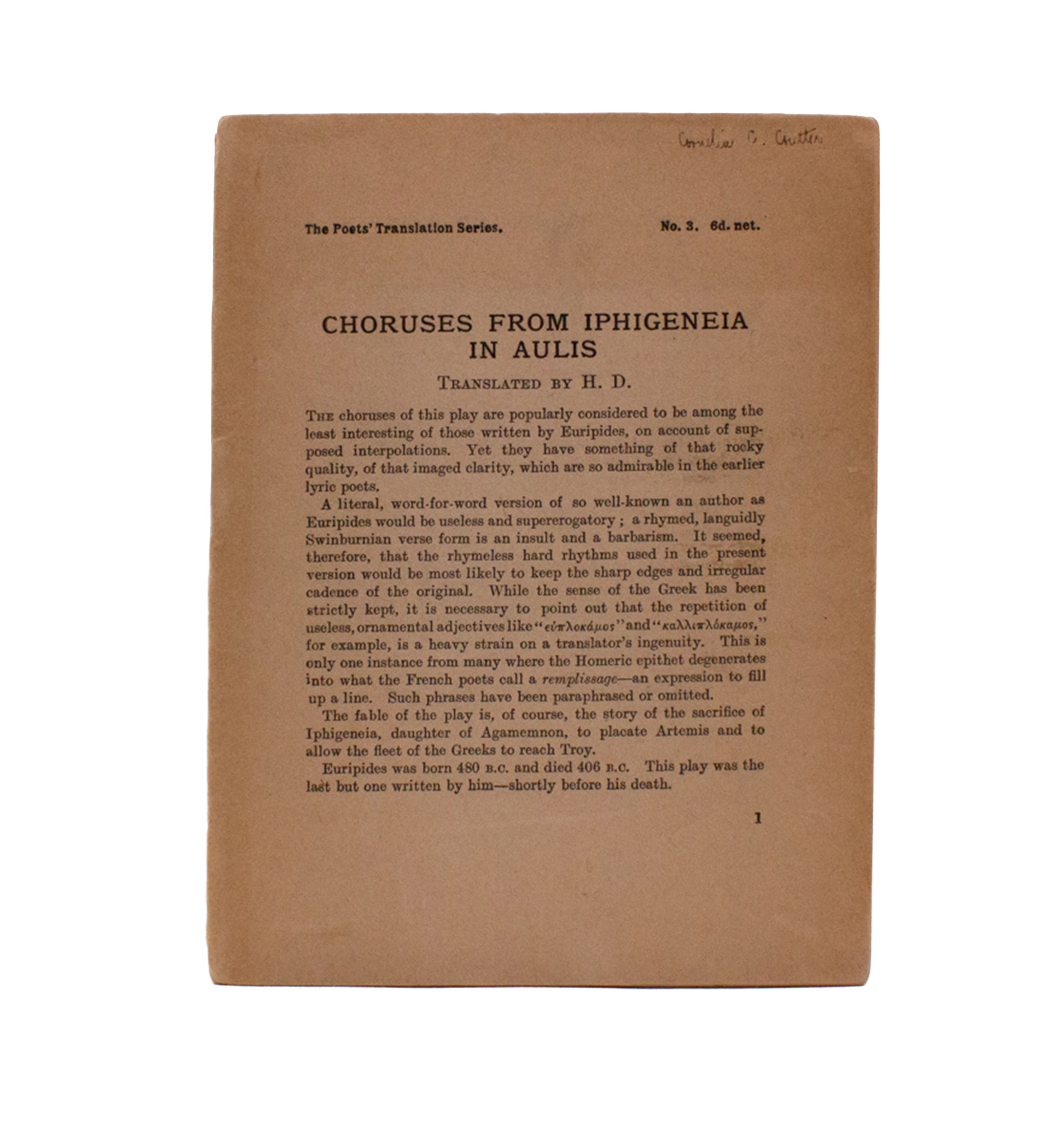 H.D.’s first solo publication, her translation of the Homeric sequence of Iphigeneia’s sacrifice, which first appeared in the Egoist the previous year. Number 3 of The Poets’ Translation Series. Very neat ink ownership of “Cornelia G. Crutter(?)” to upper right of front page. First and last pages split up to staple; last page (i.e. back cover) partly sunned, otherwise a fine copy. Boughn A1a.