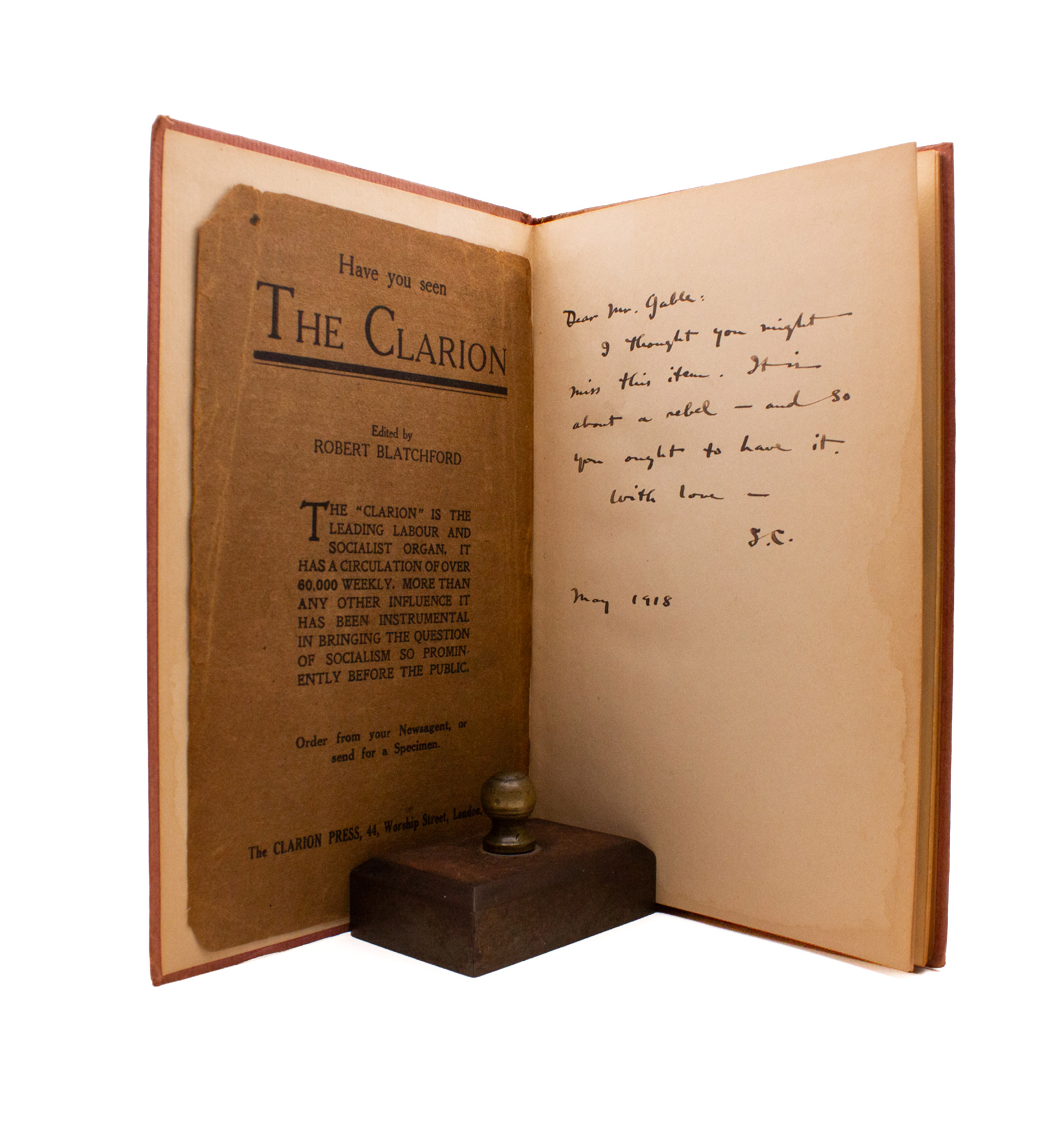 T. S. Eliot’s anonymously published essay on Pound, his second book, with frontispiece by Henri Gaudier-Brzeska and a partial bibliography provided by Pound. One of 1000 copies, this one with a brilliant gift inscription in ink to ffep, dated May 1918 to a Mr. Gable (unidentified) from Sydney Cockerell, museum curator, publisher, secretary to William Morris and renowned collector of Kelmscott Press books, intricately connected to the Socialist movement, reading “I thought you might like this item. It is about a rebel — and so you ought to have it.” Together with an advert for The Clarion, a socialist newspaper edited by Robert Blatchford laid in. A beautifully preserved copy, without any of the usual breaking of the paper boards, lightly sunned to the extremities; light stains along the fore-edges of the endpapers, but nowhere else; two pencil scores highlighting,