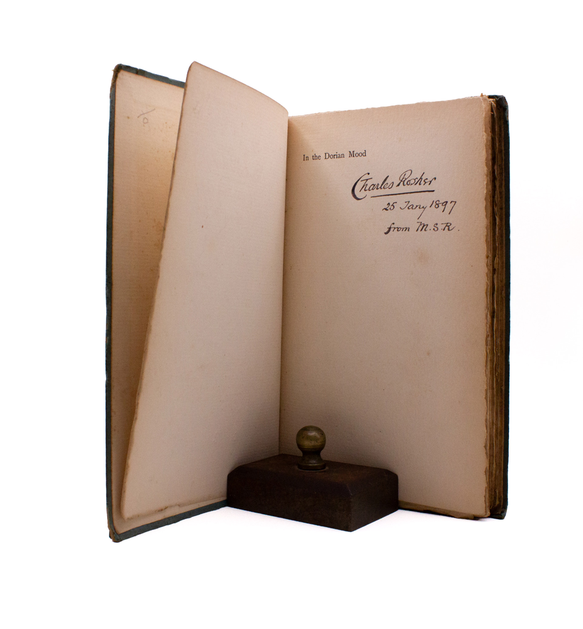 First edition, with a contemporary ink gift inscription to half-title, “Charles Rosher / 25 Jan[uar]y 1897 / from M.S.R.” and with a further ownership inscription to rpd, “Charles Rosher / 6.3.27.” Charles Henry Rosher (1858-1936) was a poet and occultist, and “Magus of Fire” in the Rosicrucian Hermetic Order of the Golden Dawn whose members included Florence Farr, Maud Gonne, and William Butler Yeats.