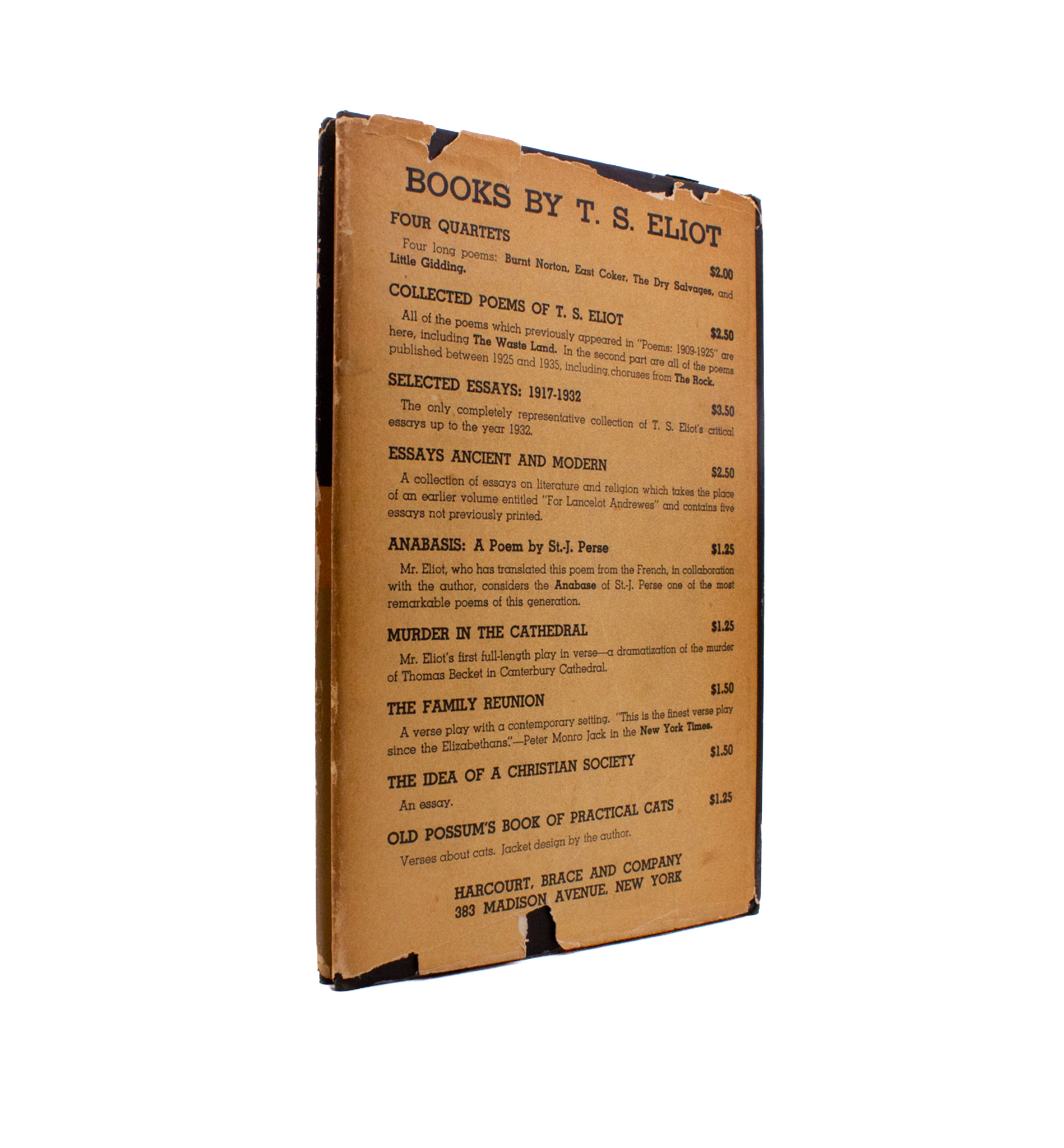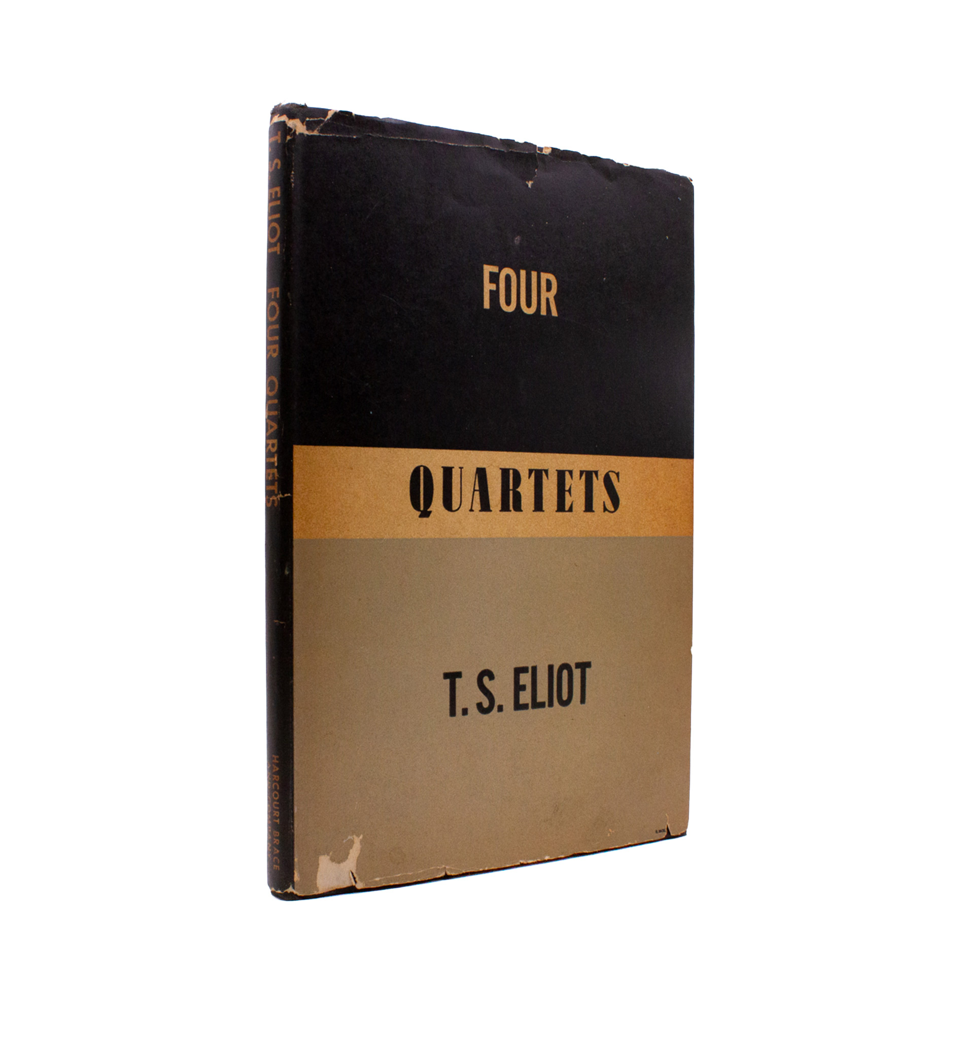 First edition, first impression of T.S.E’s Four Quartets, with “first American edition” to the copyright page. One of 788 copies to escape the publisher before the run was destroyed because of the misalignment of the text resulting in uneven margins. With the pencil ownership inscription of “Lallie Edie” to second front-facing blank and “Polly Langford Edie” to rfep. Neatly annotated in pencil throughout. Light and contained stain to the top of p.17, but leaves beautifully fresh. Endpapers and pastedowns lightly browned. Light wear and a few marks to the cloth. In the original, first state dust-jacket, a little chipped at edges.