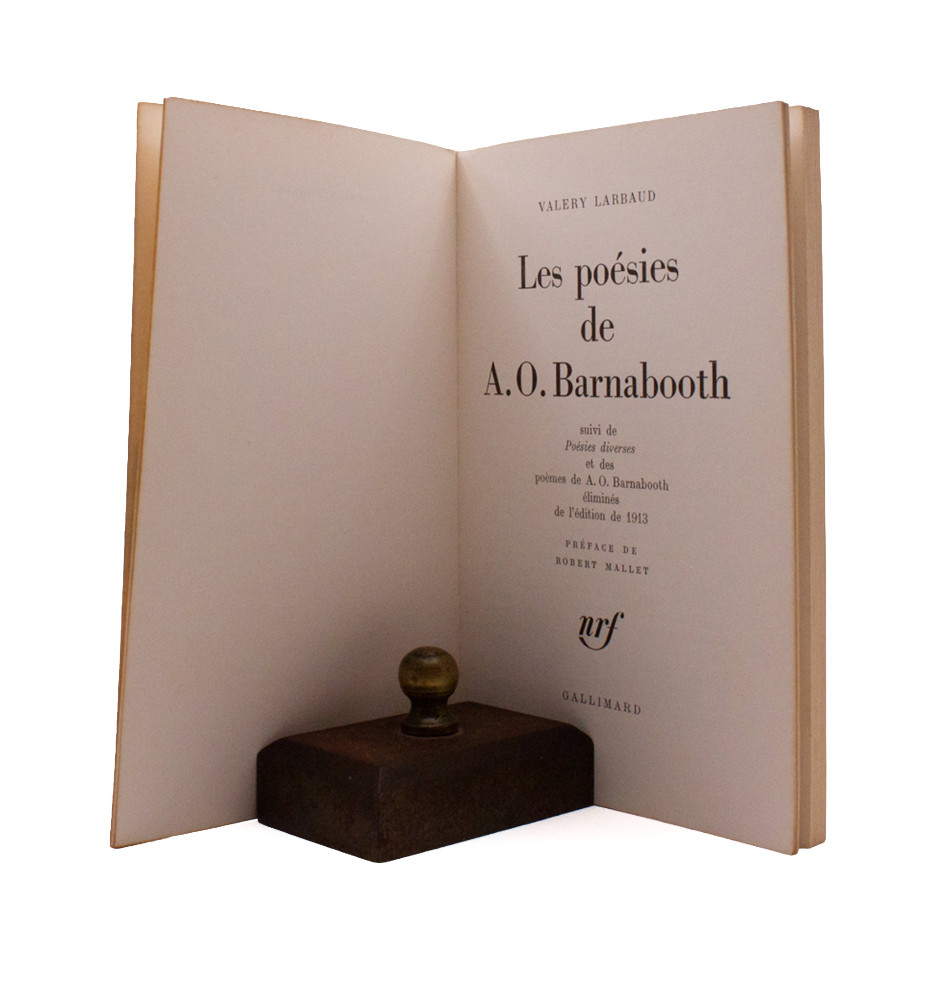 Poems by A. O. Barnabooth, one of Valery Larbaud’s (1881-1957) pseudonyms. Pocket edition, with a new preface by Robert Mallet. Clean throughout with grubbied covers.