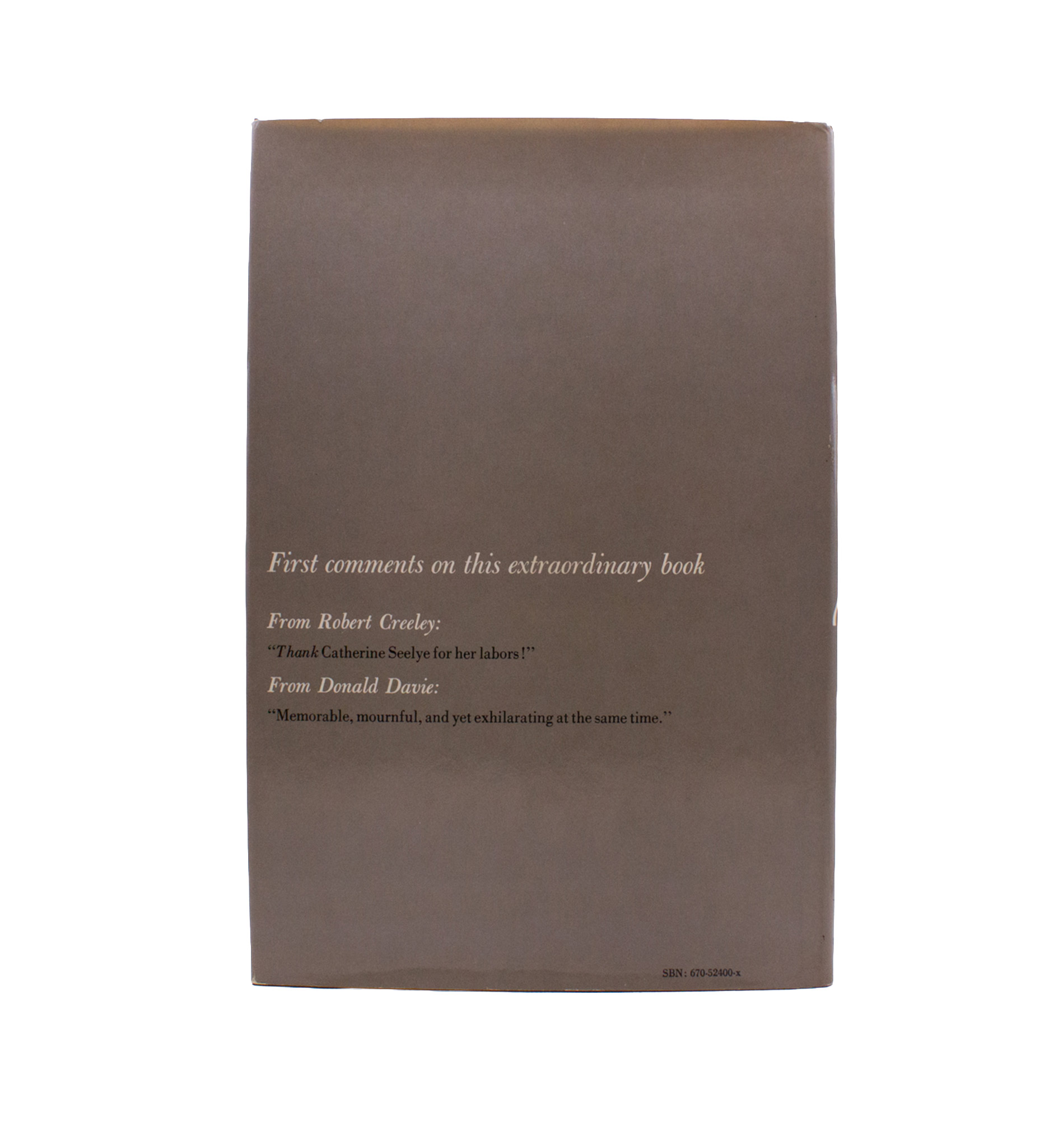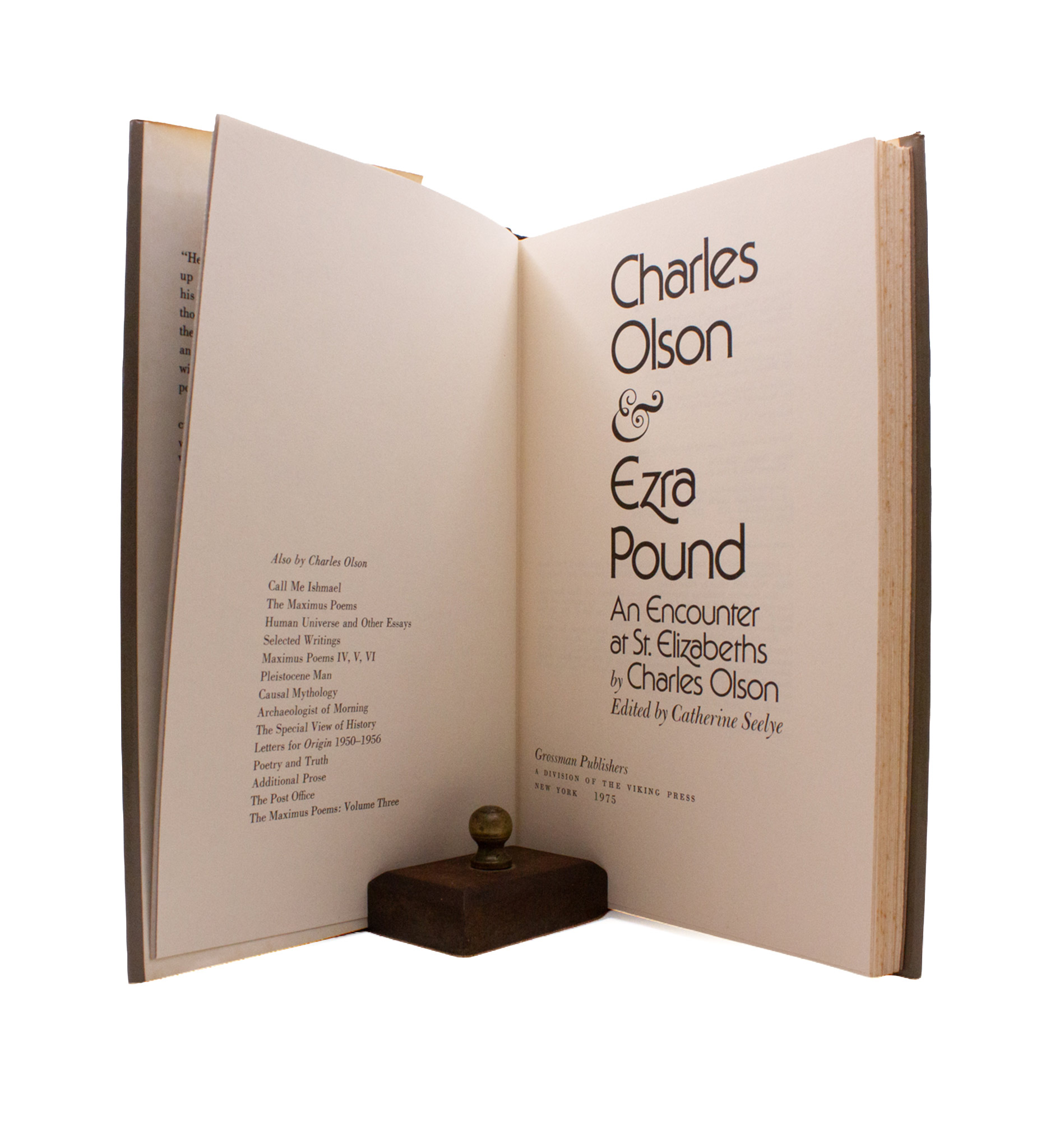 A collection of Olson’s writings on EP, during Olson’s visits to Pound at St. Elizabeths from 1946 to 1948 when Olson was at the start of his career as a writer. Olson’s writing is typical of a student fighting against the rhetoric of their teacher, and a great document of what it is to evaluate Pound personally. First edition. A very good copy with the edges of the jacket folding outward slightly.
