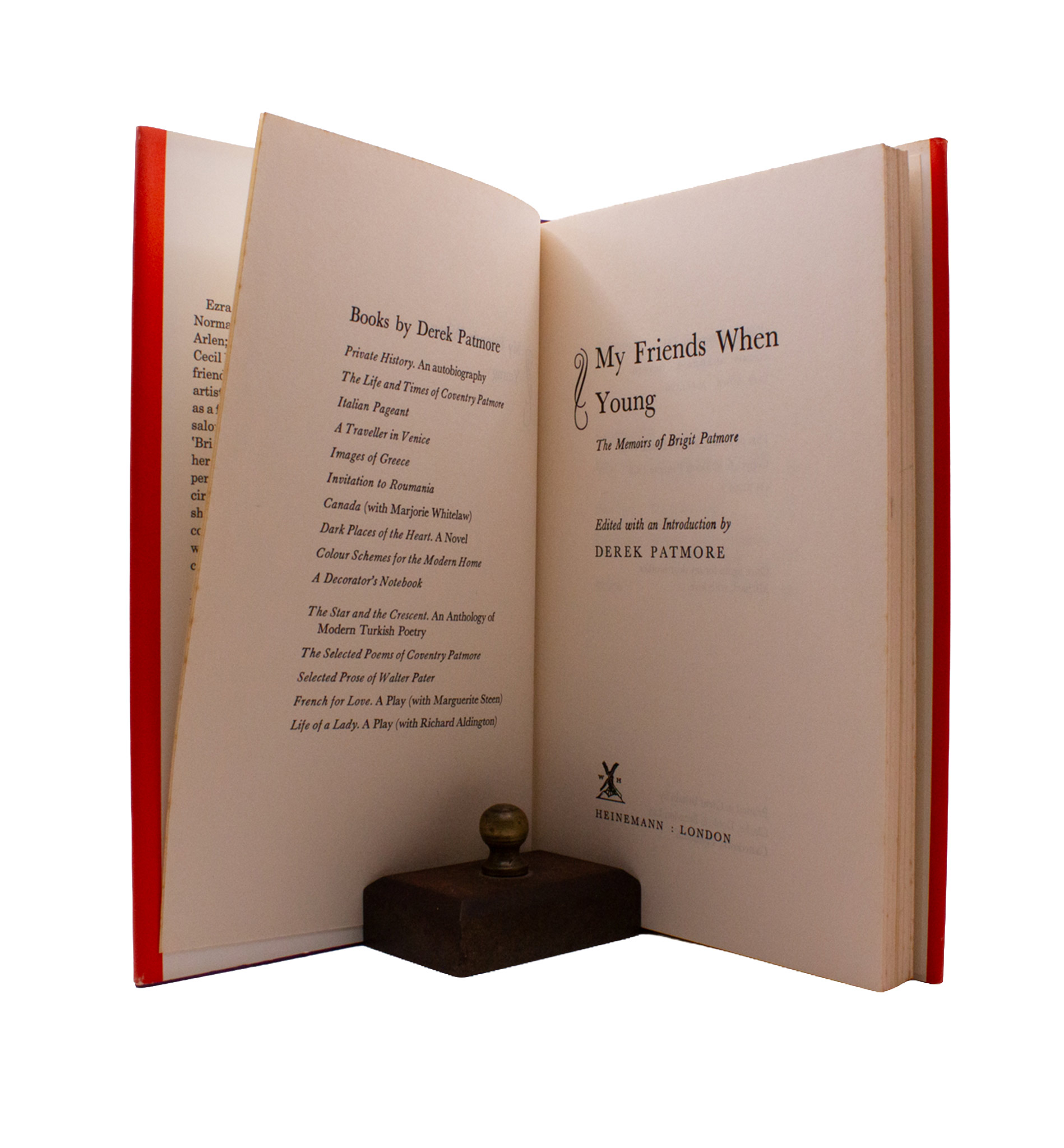 A composition of Brigit Patmore (1888-1965)’s papers, which she was encouraged to write by bookseller Betram Rota, by her son Derek Patmore (1908-1972), full even in his introduction of all the names of the age whom Derek had known as a child. Brigit Patmore, Richard Aldington, EP, and H.D. once “made a four [who] would go around together most afternoons.” After Aldington and H.D.’s divorce, Patmore lived and travelled together with Aldington. First edition, a fine copy, the spine of the jacket sunned, with the very occasional pencil note by David Moody.