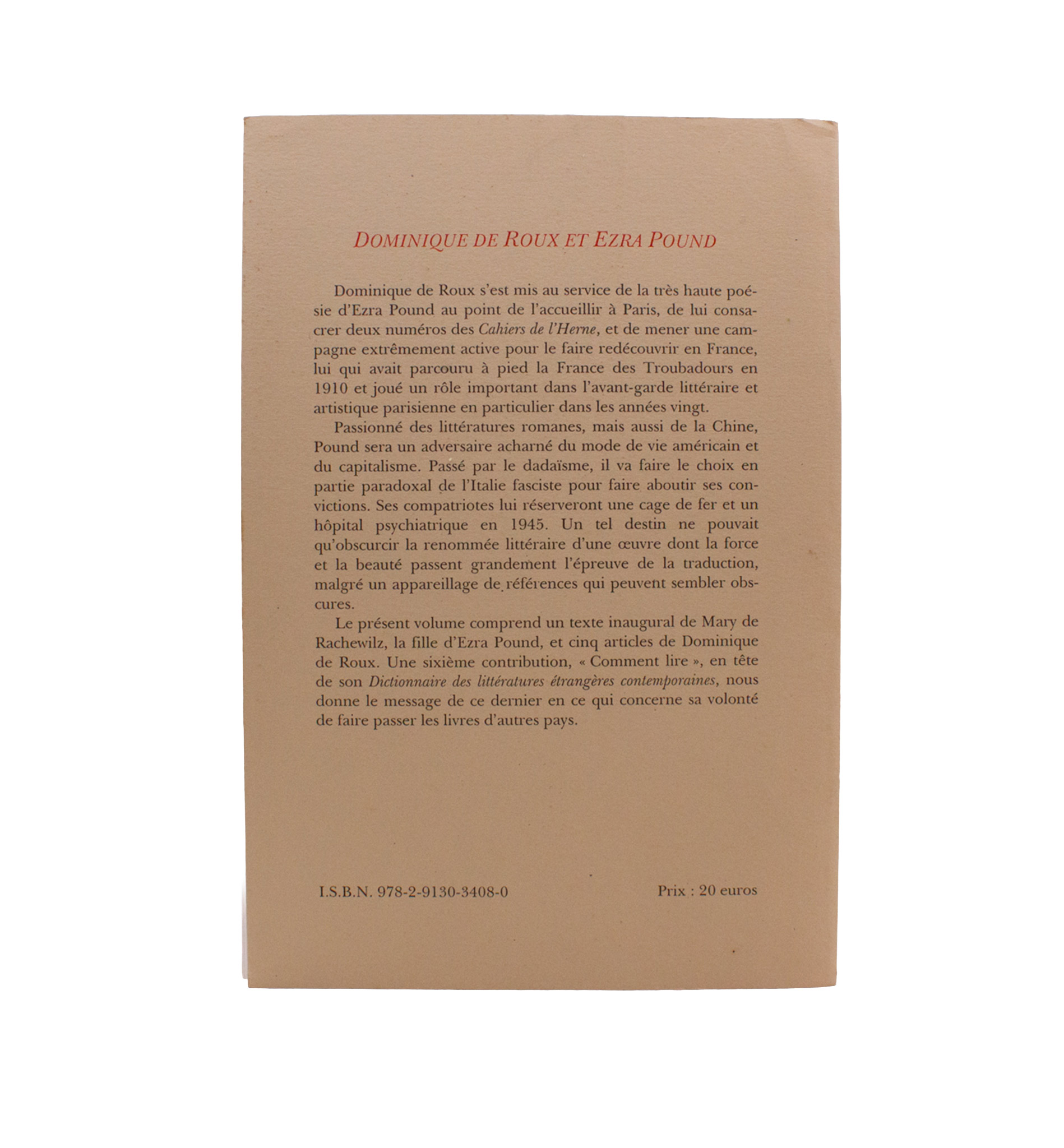 A biography of de Roux, writer, publisher, and editor of the EP Cahiers de L’Herne. With one chapter given over to de Roux and Pound’s first meeting in 1963. A good copy a little grubby on the extremities.