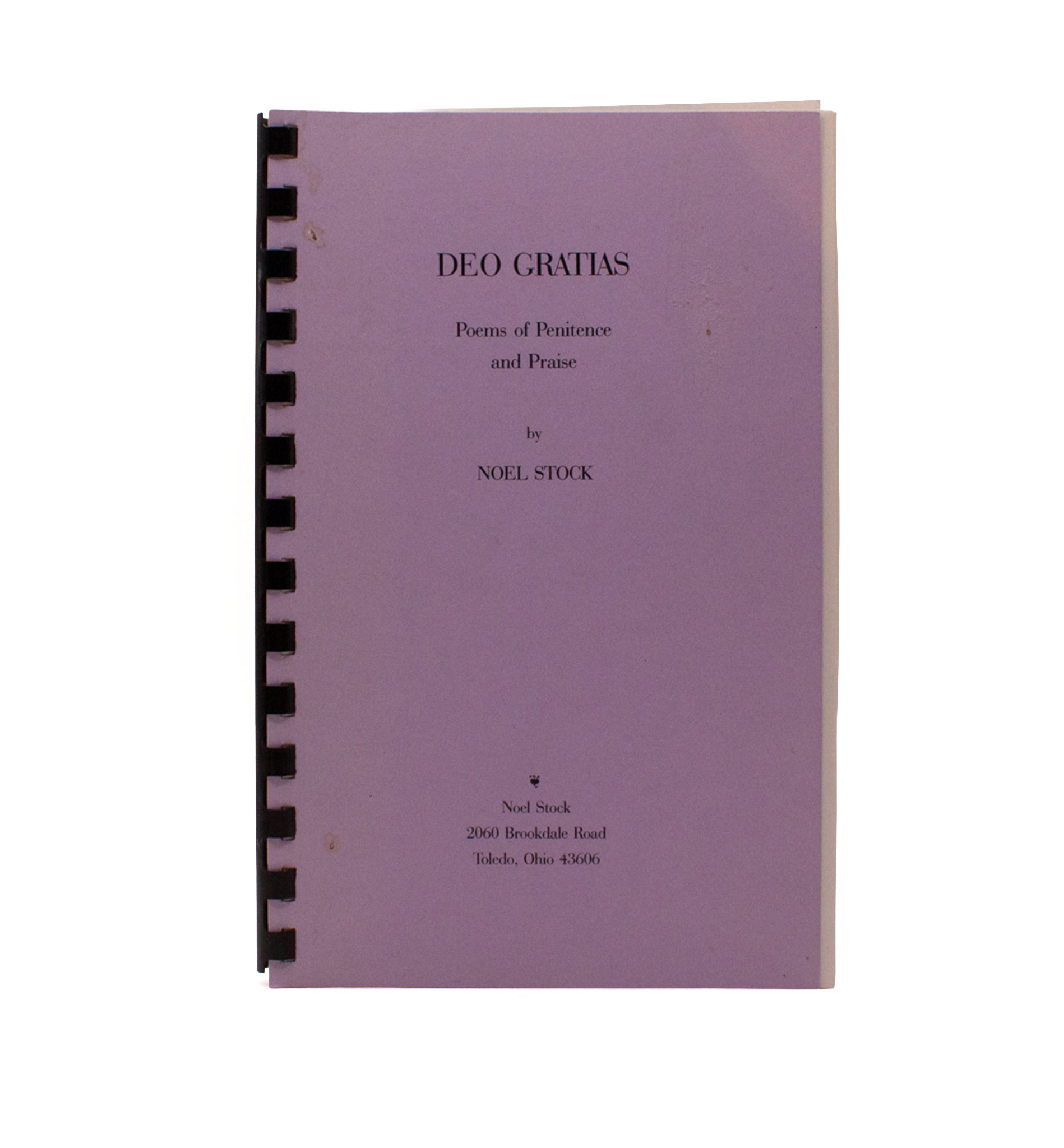 Five books by stock, all privately printed. The first 3, Twenty-Eight Poems (1994, No. 8 of 50 copies, signed to the limited page, a further gift-inscription to ffep), Fourteen More (1995, No. 6 of 30 copies, unsigned) and Numbers XLIII-LX (1996, No. 7 of 40 copies, unsigned) complete his book, Numbers. Vespers (1999, unnumbered & unsigned) is a collection of poems, starting with a sequence of the same name. The last, Deo Gratias; Poems of Penitence and Praise (2005, unnumbered, with the author’s ms. correction to p.68, wear to front cover) is, as Stock writes in the gift inscription, “not a published book but cheap laser-printed ed. to send as text to publishers and a few friends and aquaintances.”