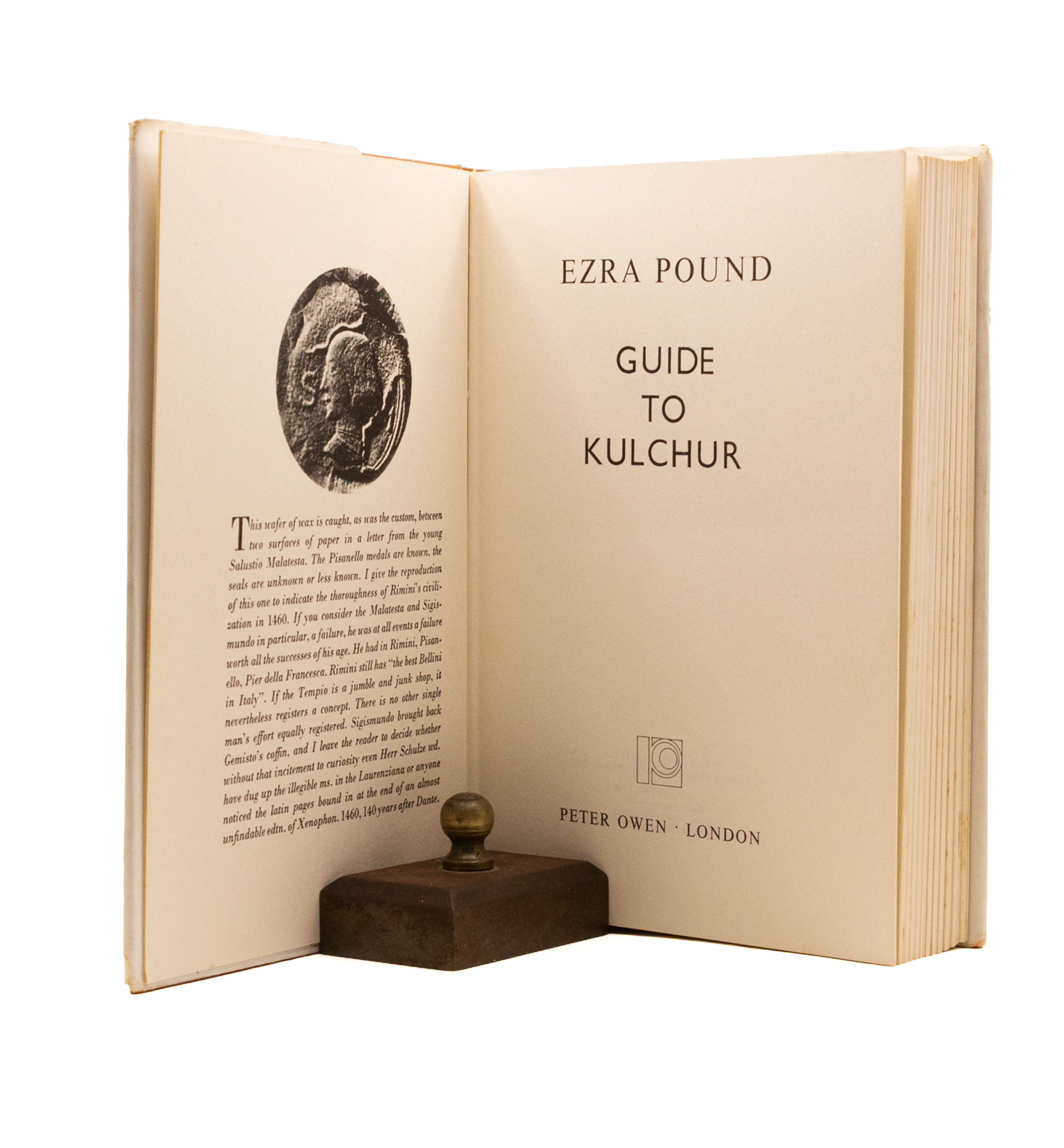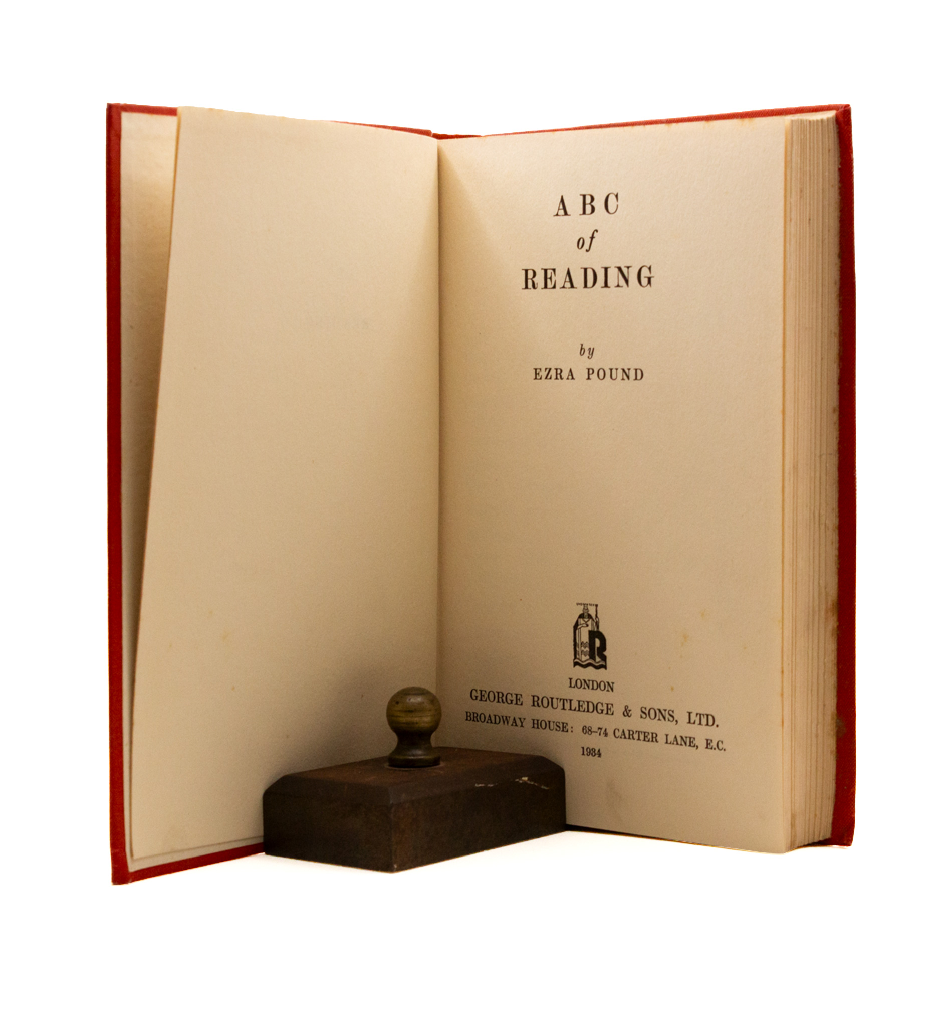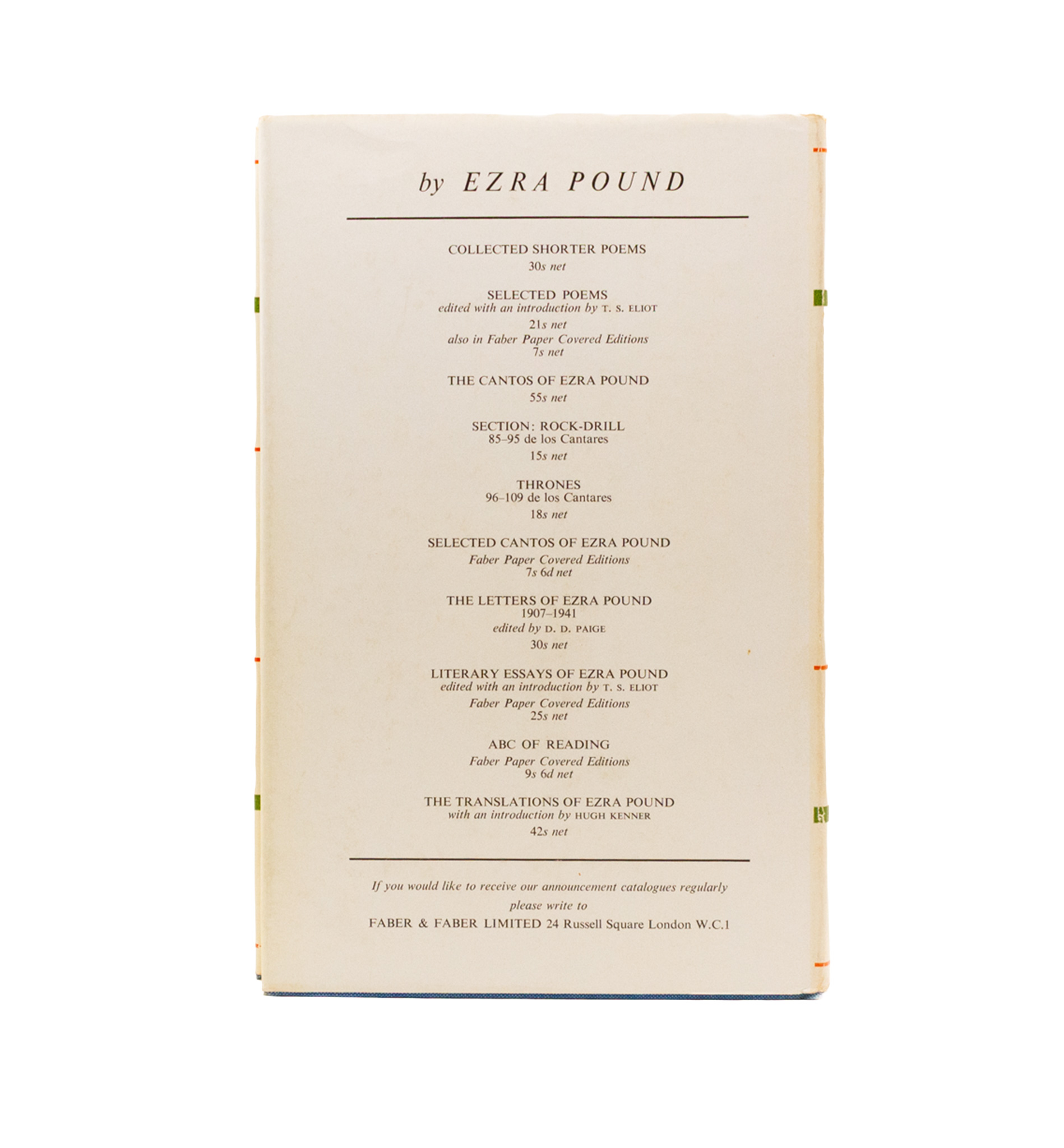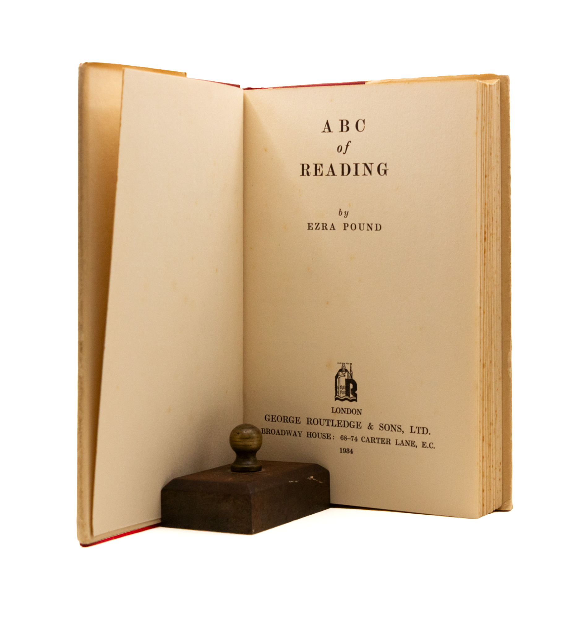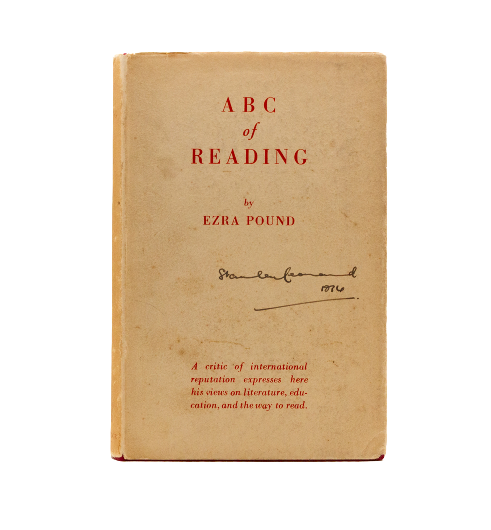 Pound’s text-book to be read “for pleasure as well as profit.” First edition, in the original dust-jacket with light marks & darkened to spine. Ex-libris of Stanley Leonard (?), with his ink ownership inscription to ffep and, unusually, to the front of the jacket. Further annotations in red ink, all simple underlines or scores in the margin, performed with a ruler and so neat you might’ve thought the book was published with them. The boards & gilt of this copy incredibly rich in colour. Gallup A35a.