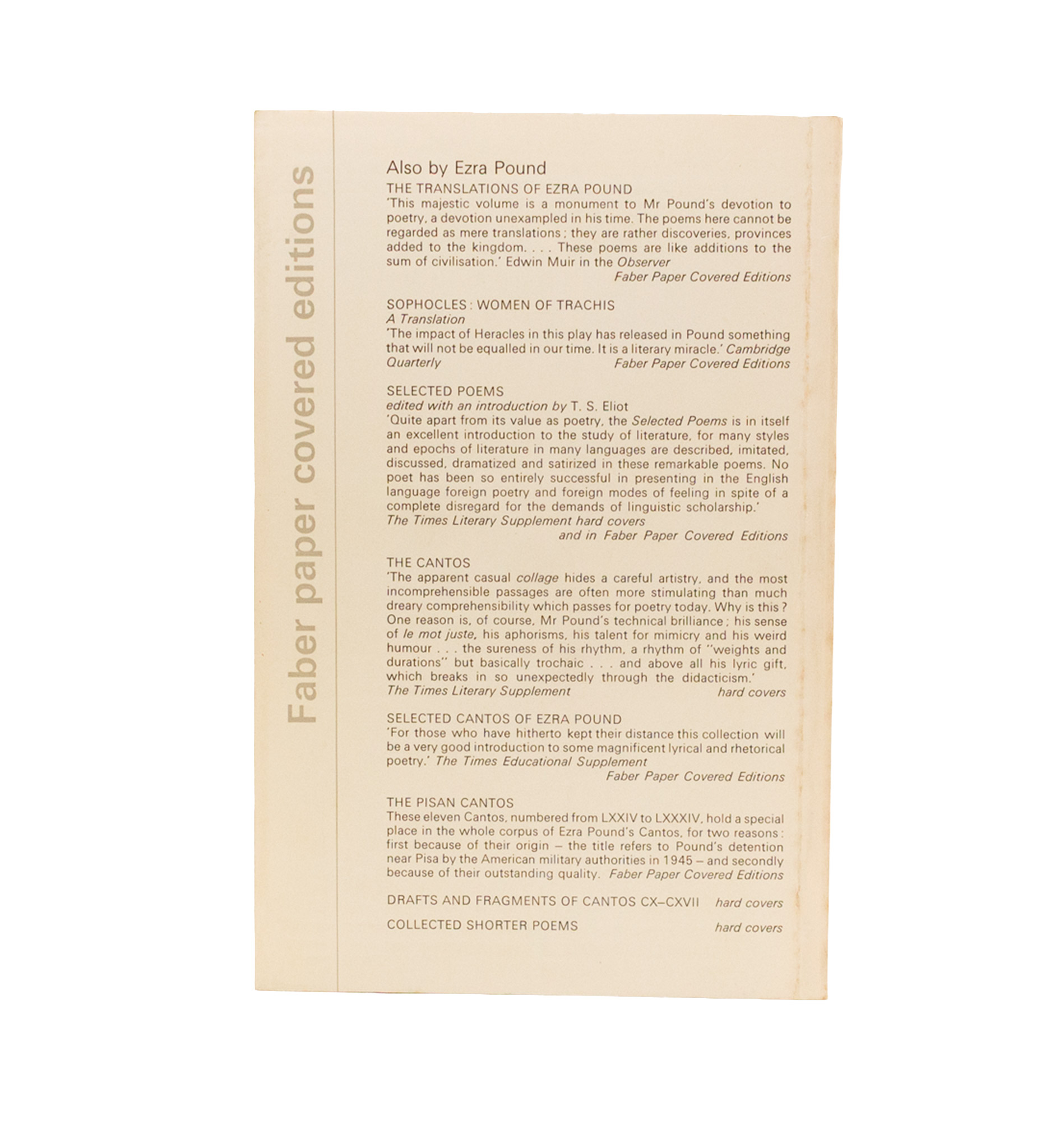 A fourth reprinting after additions of Faber’s paperback Selected Poems, with David Moody’s brief pencil annotations to the contents pages noting Cathay as “complete” and denoting the order of appearance of the poems in Personae, 1908, 1909, 1910. Fine save discolouring and light creasing to the spine. This printing too late for Gallup, but otherwise A97b.