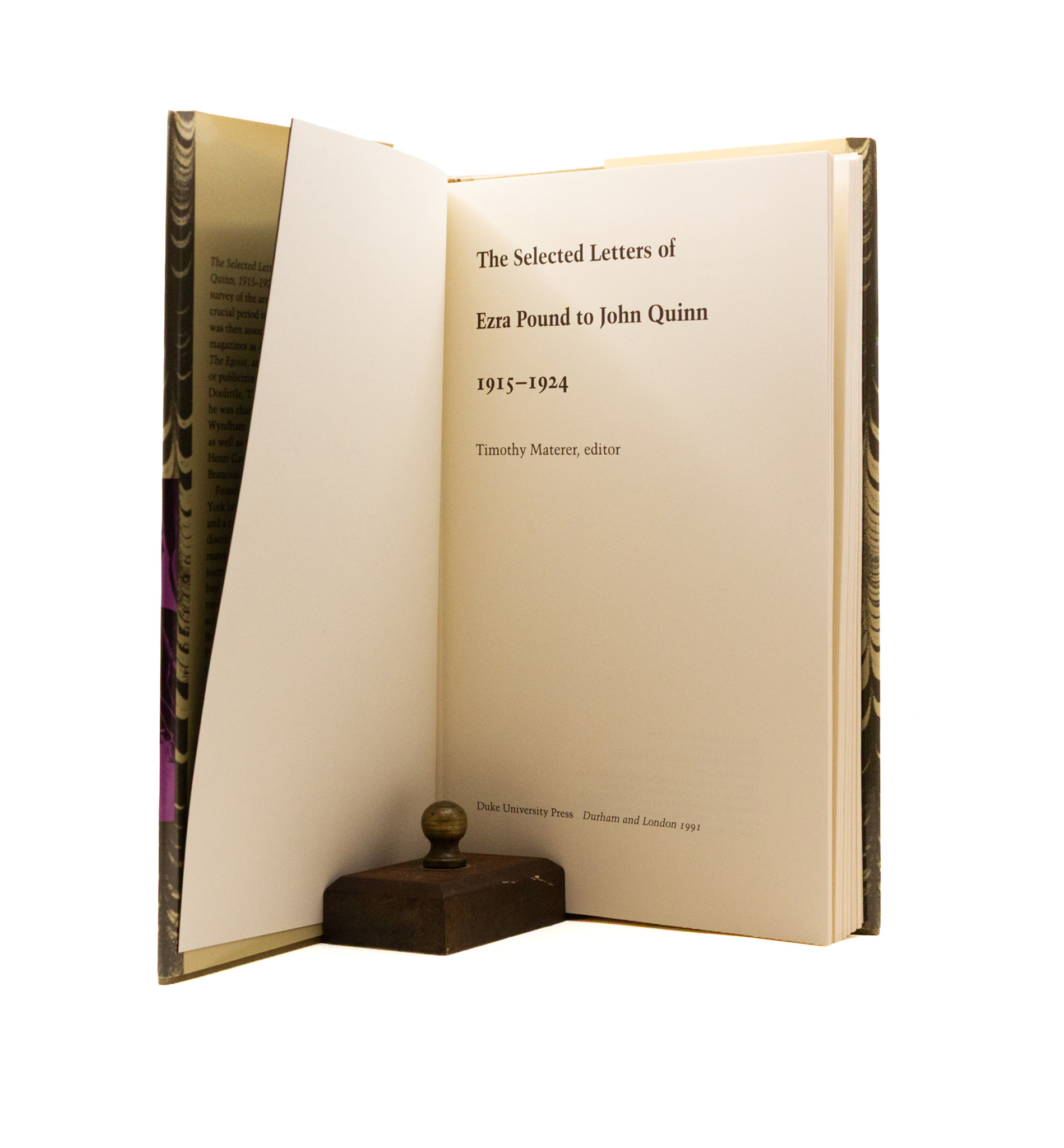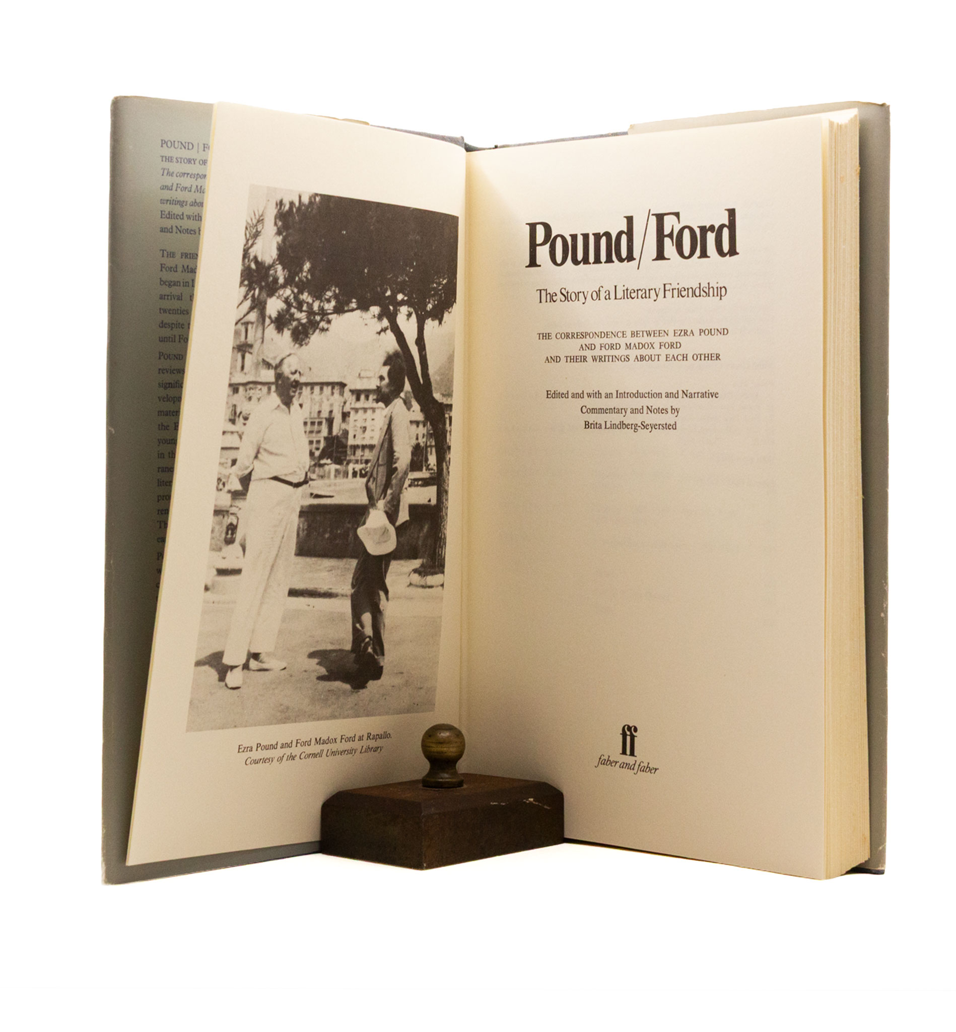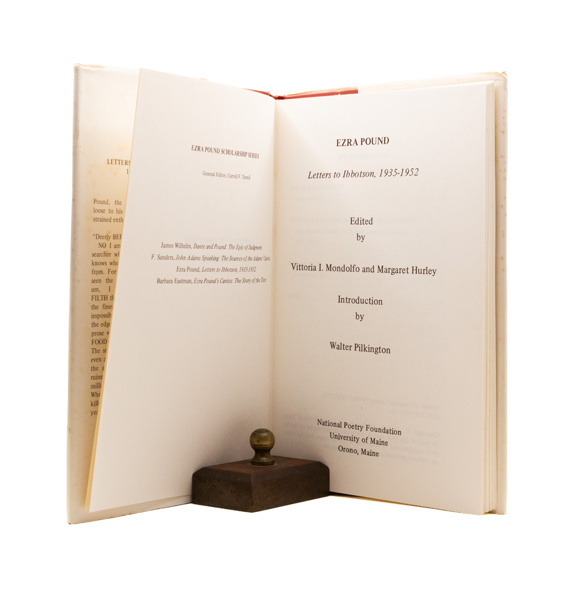 Joseph Darling Ibbotson (1869-1952), or “BIB” to Pound, was a Professor of English Literature, Anglo-Saxon & Hebrew as well as Librarian at Hamilton College, and one of the three faculty members who influenced Pound’s career and remained friends for life. Pound’s photograph in the 1905 Hamiltonian is captioned “Bib’s pride,” and as Pound wrote to Prof. Harold W. Thompson of Cornell, “The CANTOS started in a talk with BIB.” These 36 letters, all from EP to Ibboston, with the occasoinal from DP, begin in 1935, with Pound in Rapallo, and end in 1952 on Ibbotson’s death. With scans of the originals. One of 400 copies, with the publisher’s errata slip laid-in. With pencil annotations by David Moody. Jacket lightly foxed, blooming on flaps, top-edge lightly worn; top-edge of leaves spotted. Gallup A102.