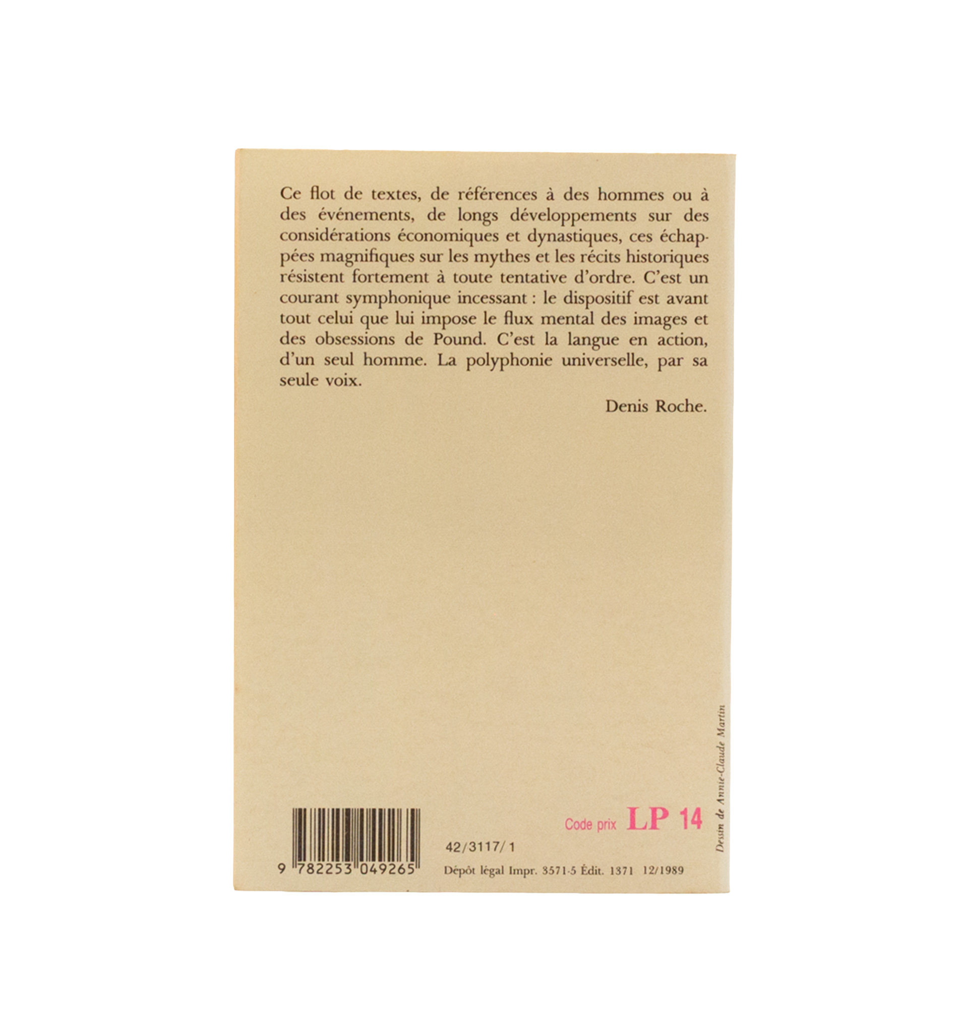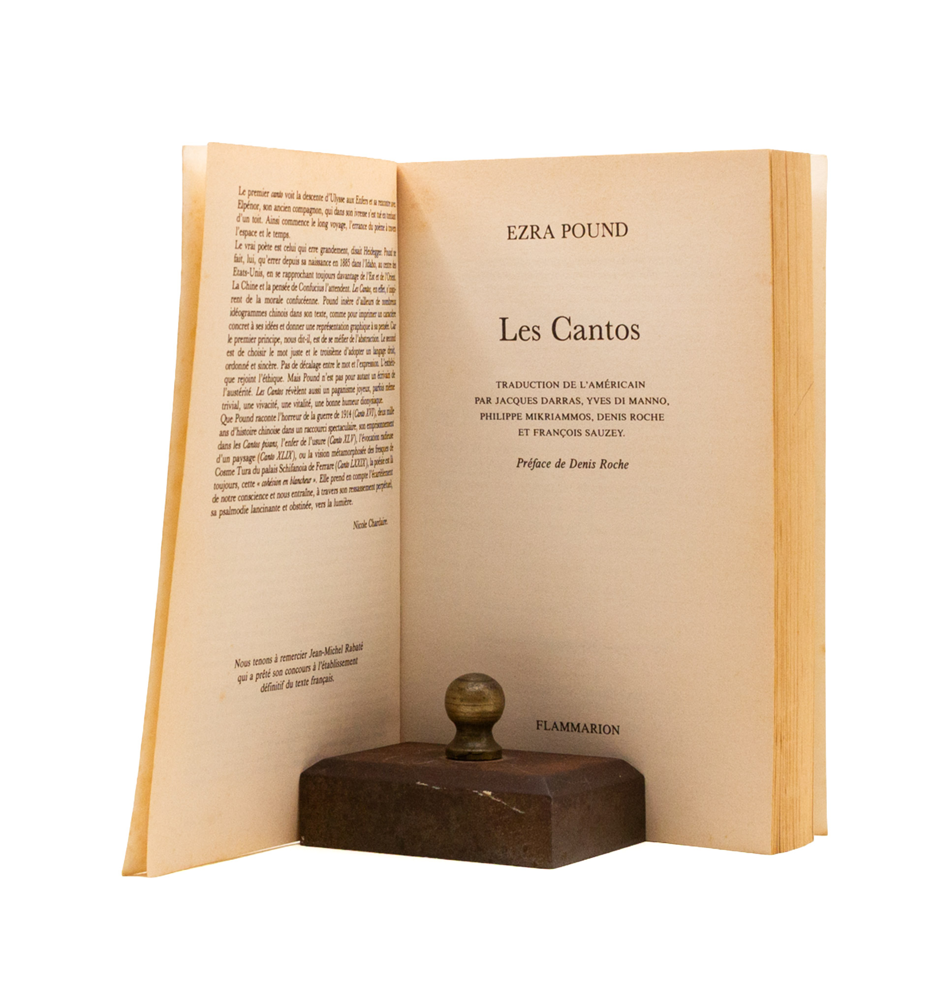 First French translation of Pound’s essay, I Gather the Limbs of Osiris, containing Pound’s early scholarly method, Luminous Detail, first appearing in the New Age, Nov. 1911 to Feb. 1912. Inscribed to A. David Moody by Jean-Michel Rabaté on the ffep, dated Dijon, March 1991. With David Moody’s occasional pencil inscription and a handwritten note laid in. A further postcard announcement laid-in from the publisher. Some light sunning at edge of spine, and a light crease to spine. Too late for Gallup.