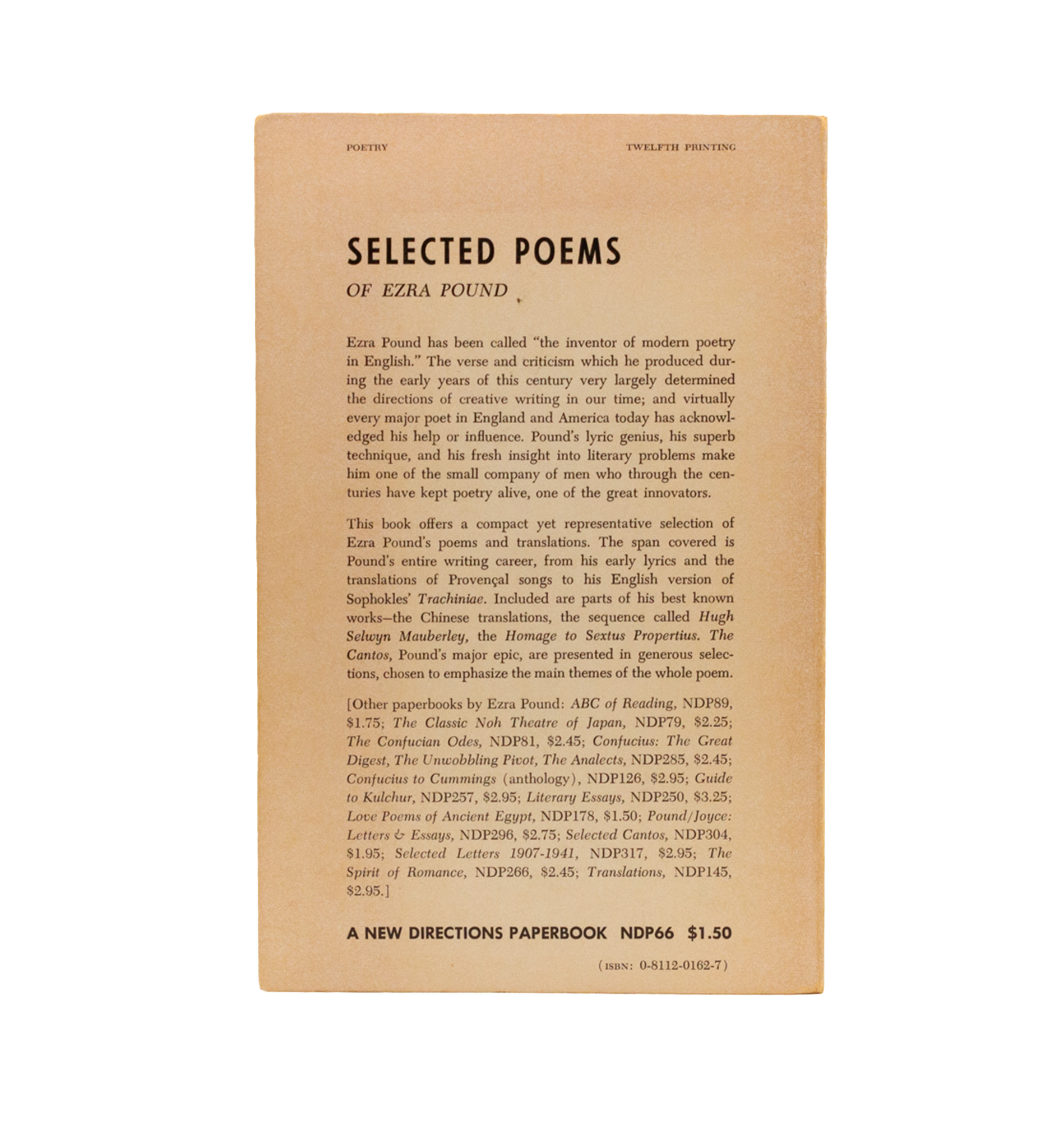 A late, revised edition, 3rd impression, of Pound’s first book of prose, upon the poets & playwrites that inspired him in Romance languages. Printed with spacious margins begging to be scrawled in. Jacket spotted & lightly stained, book fine within. Missed by Gallup, otherwise under A5.