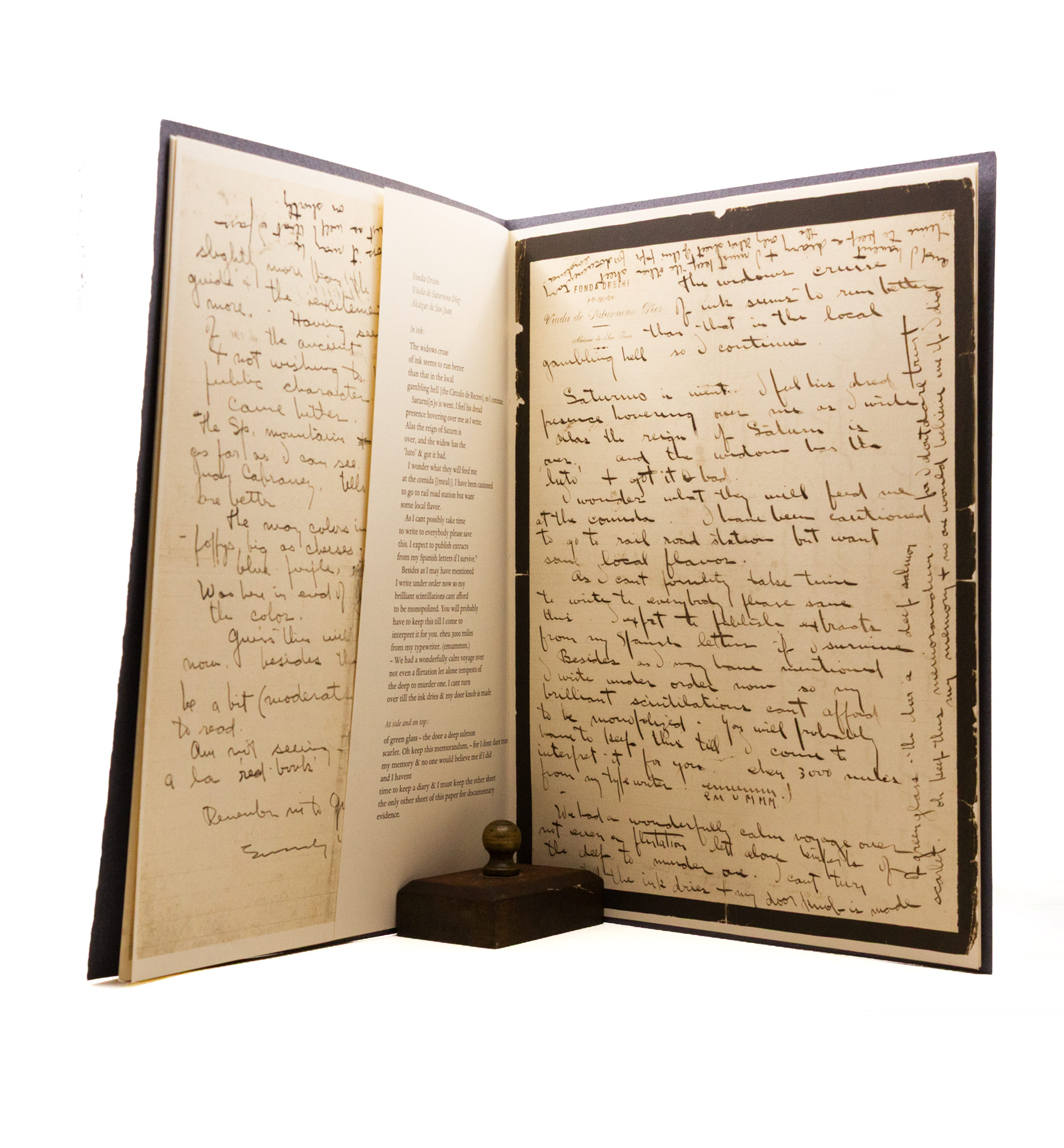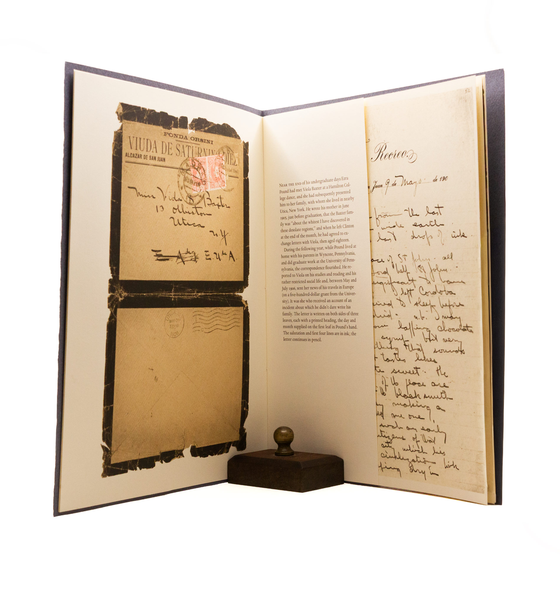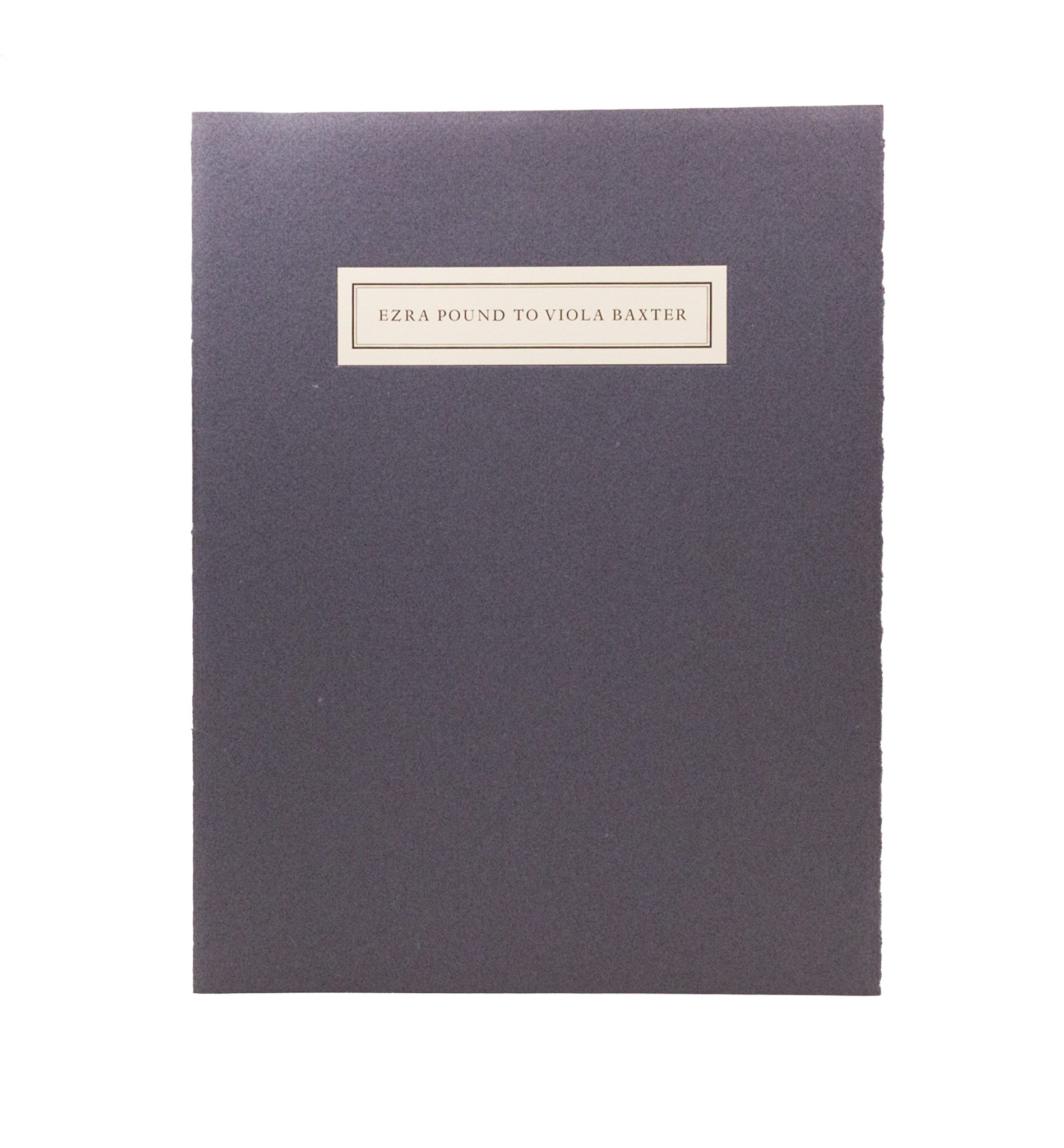 of which was sent to Viola Baxter, who met Pound at a Hamilton College dance, in May of 1909 from Alcazar. A tale or two of Pound’s touristic trouble with the locals, against good hospitality & his travelling forth. One of 500 copies printed in celebration of Pound’s 100th birthday, with colour reproductions of the letter and envelope. Fine in the original card and clingfilm packaging.