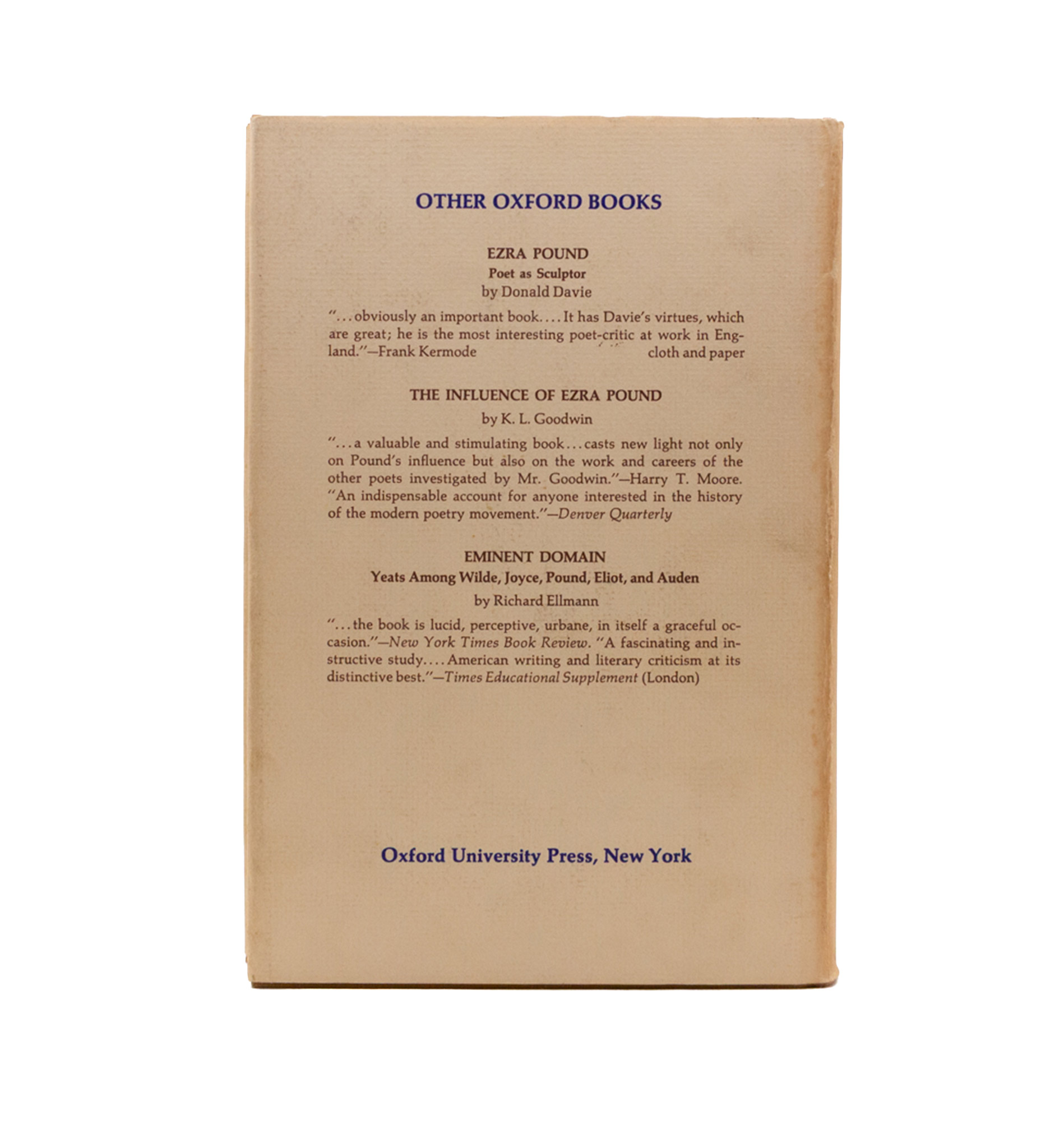 Biography of Pound to date, this one with divisions by relation, such as Pound and Yeats, Pound and Frost, Pound and Eliot, and a chapter given over to Pound’s 1939 visit to the USA. First edition, near fine with blooms of foxing to first few and last few pages, in a good jacket with one tear to the back of the spine. With the occasional factual correction by David Moody.