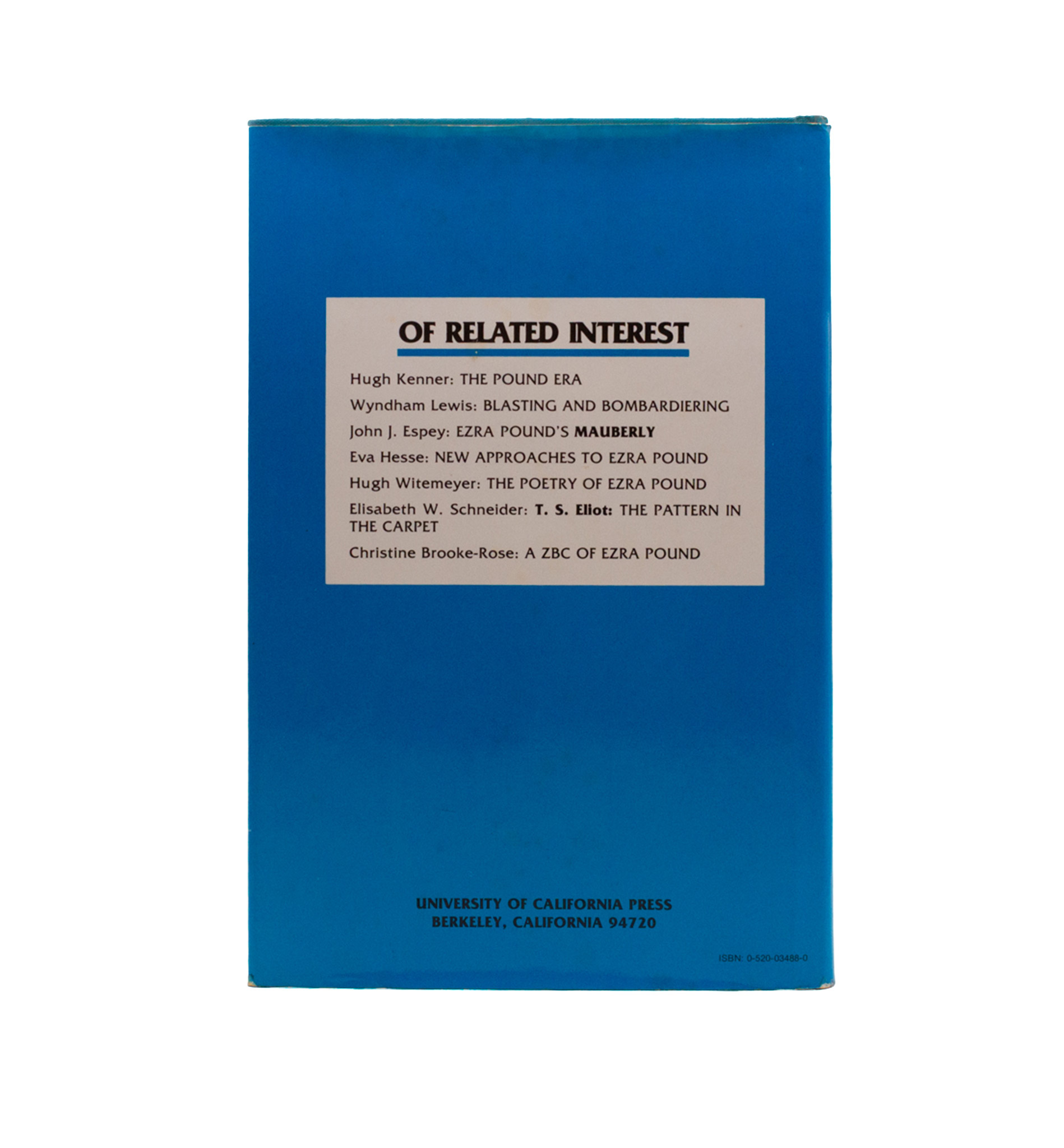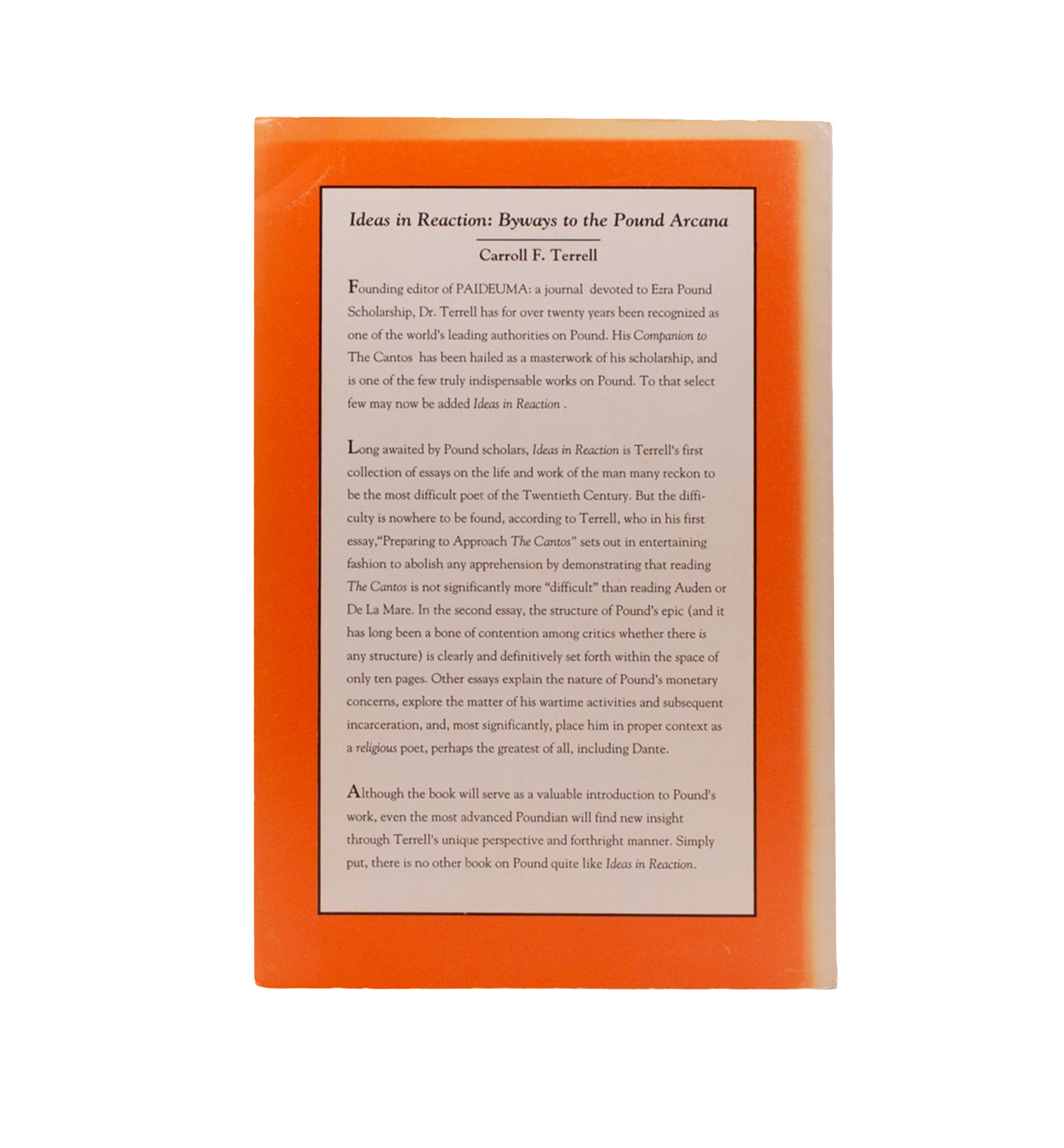 A set of essays by the great annotator on The Cantos. A chapter on “The Structure of The Cantos” presents venn-diagrams, wheels within wheels, traingles, and tetraktys arrangements for the China and Adams Cantos; the book not, however, including Forrest Read’s ’76 in its bibliography. Further essays on “Pound vs. Reductionist Orthodoxies,” “Debt-Free Money,” “The Divine Mystery,” a seminar-conversation student to expert, a review of EP and DS: Their Letters, Pound-Joyce, Pound and his silence, madness vs treason. First edition, lightly read with the top corner gently leafed; sunning to spine spilling over onto covers.