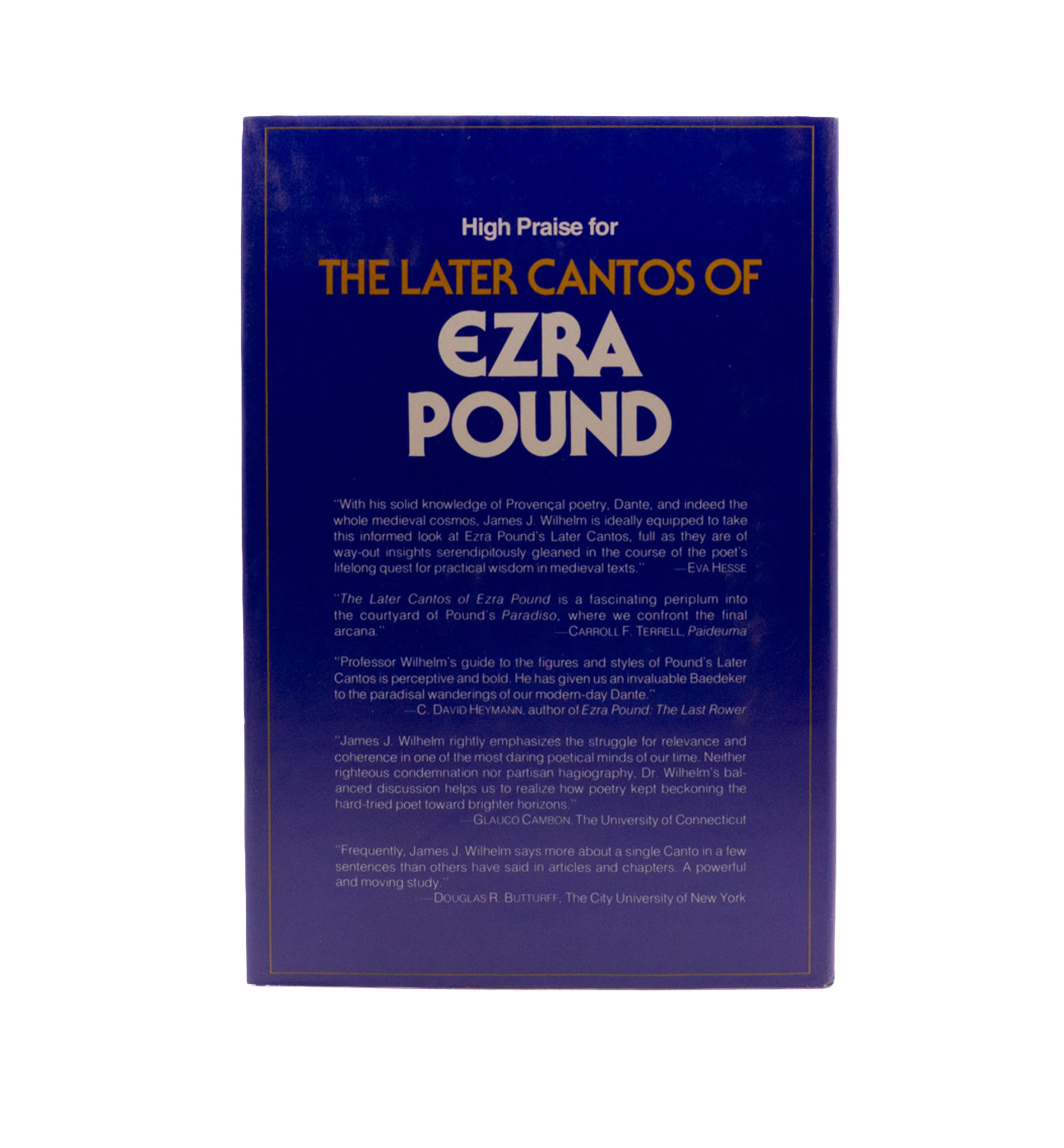 Wilhelm’s first book on Pound, a comparison between the two epic poets who, as Wilhelm identifies, are the only to write judgement at every step of the way. With due chapters on Guido Cavalcanti, mentor to Dante and mask to Pound. Readers may aso be interested to find Wilhelm’s Il Miglior Fabbro: The Cult of the Difficult in Daniel, Dante and Pound (1974). First edition, the spine sunned with a touch of shelf-wear, otherwise fine, lacking the jacket. The occasional pencil note by David Moody.