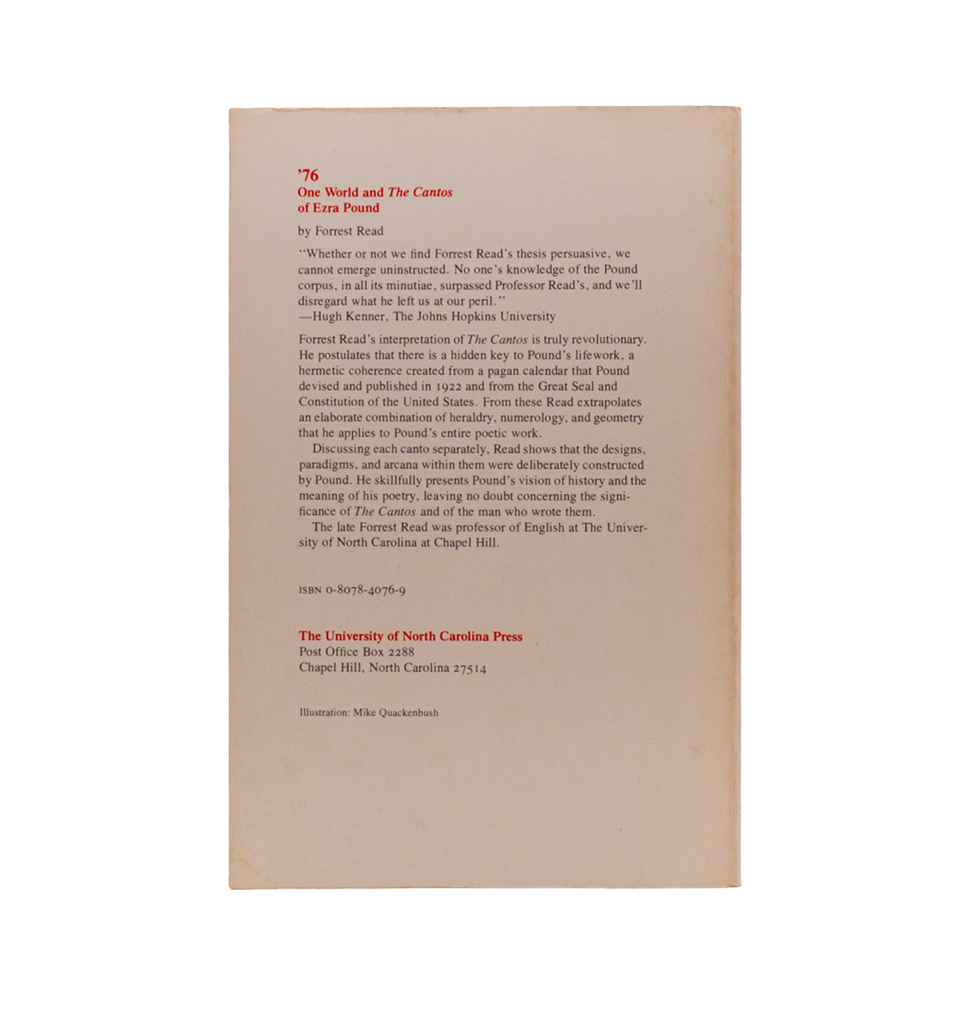 A megalithic piece of Poundian scholarship, and to me one of the finest for its divergence and (you might argue) delusion. Read argues for The Cantos’ coherence, discovering Pound’s plan to be based upon a Calendar he published anonymously in The Little Review, Picabia Number, the Seal of America, the Constitution & Declaration of Independence, and the Four Tuan. First edition, paperback issue, with light paperback-usual creasing.