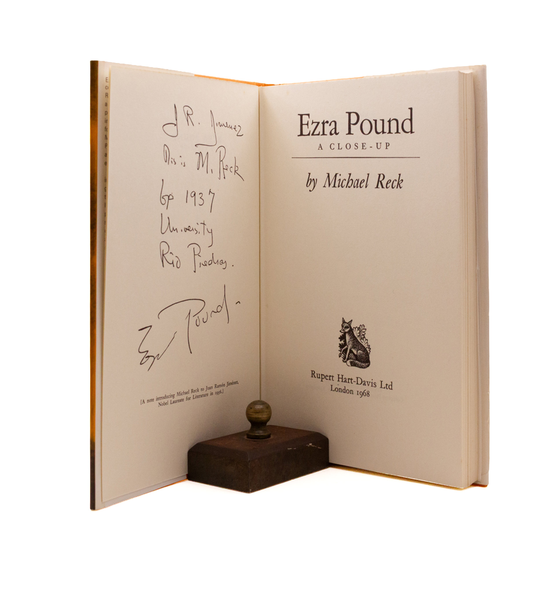 Letters from Pound to Meacham, a sales manager, poet and critic, from 1957 to 1960, with commentary by Meacham and a little further correspondence from Archie MacLeish and a reproduction of a letter from Robert Frost, T. S. Eliot and Ernest Hemingway to the Attorney General imploring Pound’s release. With facsimiles of some of Pound’s letters, and portraits. First edition; a beautiful production, fine throughout; jacket a little nicked.