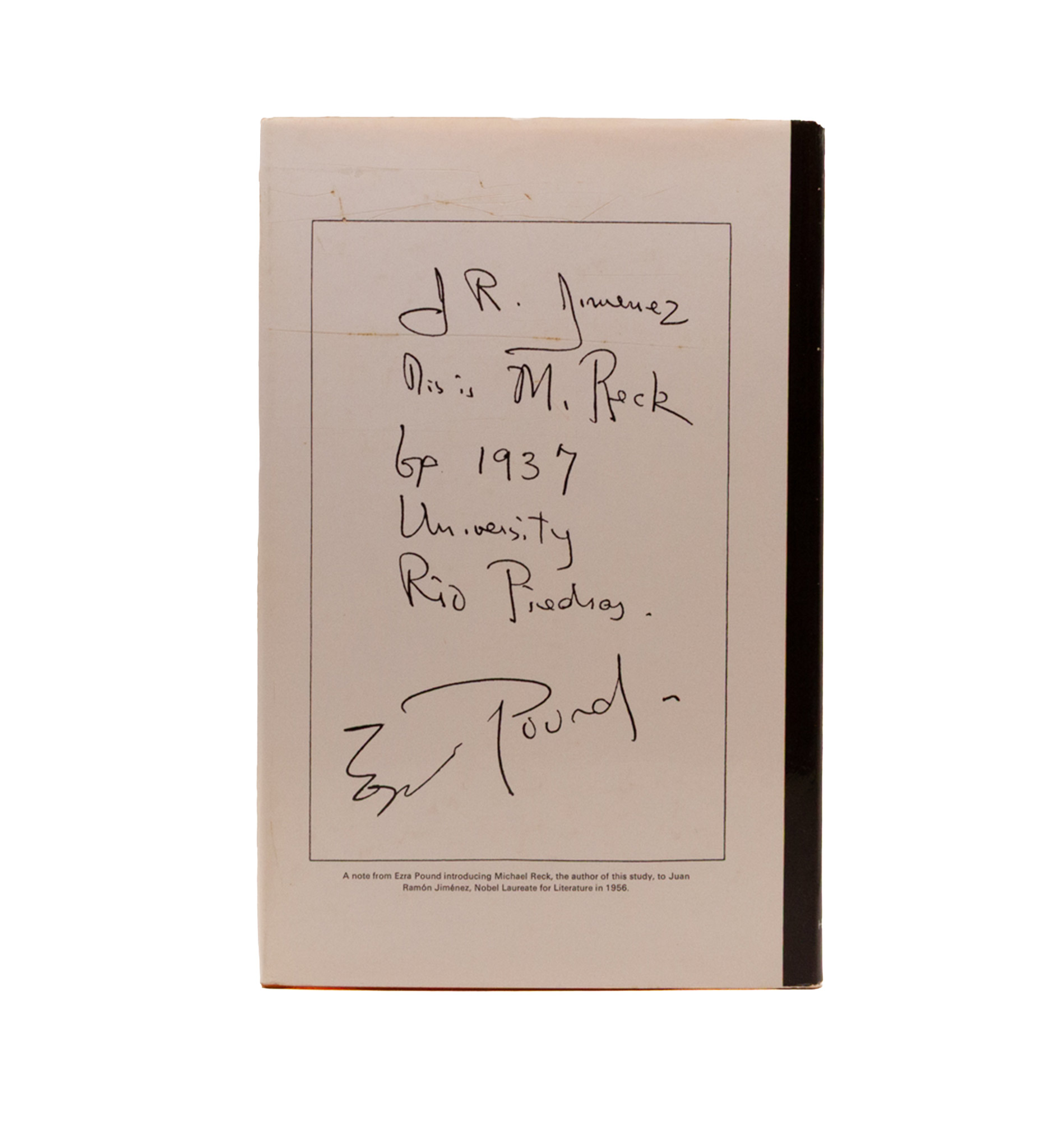 A kind of biography of Pound, with a personal account of Reck’s knowing him at St. Elizabeths. Reproduces a letter from Pound to Reck (who was then in Japan with the Army) guiding his translation of the Women of Trachis into Japanese; and, interleaved verse by verse with Pound’s, Fenollosa’s translation of Li Bai’s “Exile’s Letter” (partial) and “The River Merchant’s Wife.” First English edition, one year after the American. A fine book with Moody’s occasional annotation in a very good jacket, a few scratches to the back cover and one small tear to the front. With a photocopy of Michael Reck’s Memoirs of a Parody Perry from the Appendix of Ezra Pound & Japan, pub. Black Swan Press 1987, laid in to rear, dedicated in felt from Reck to Moody, 1983.