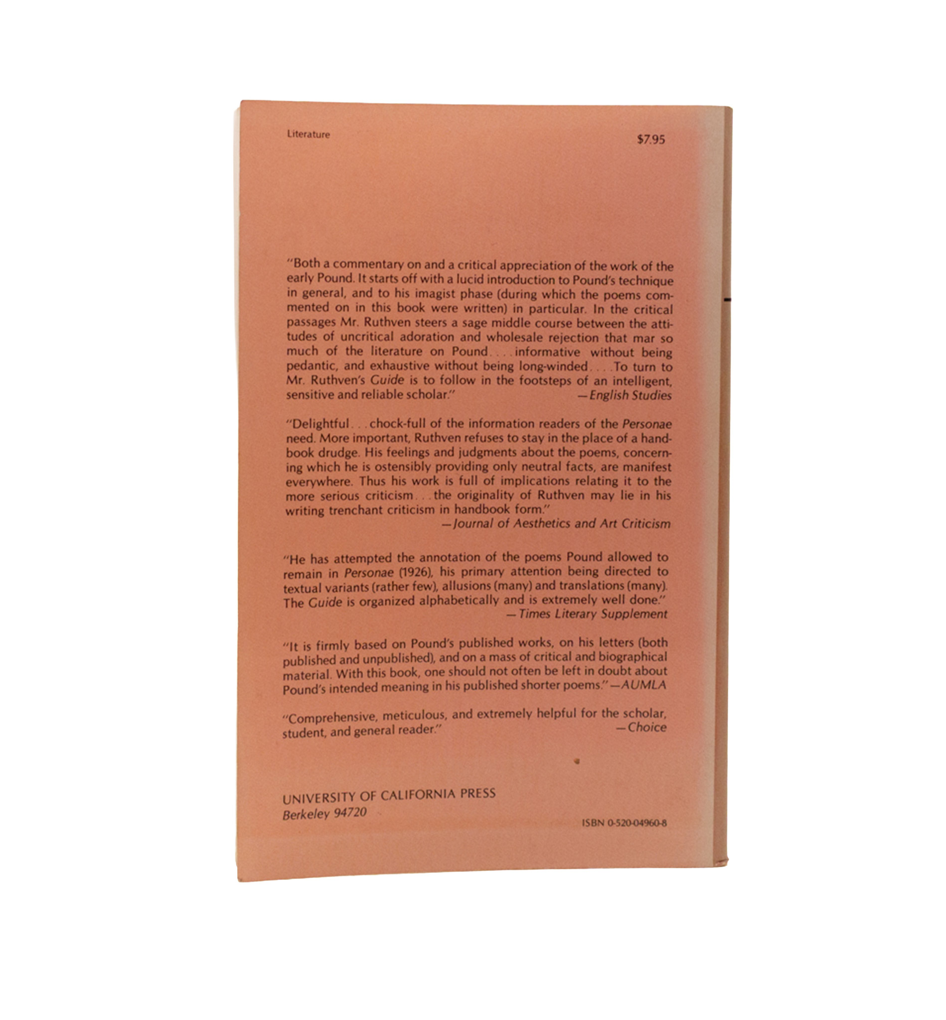 Part of the Ezra Pound Scholarship Series edited by C. F. Terrell. One of the two books on the China Cantos to be published in ’83, marking the advent of developed studies of that section. First edition. A fine copy with a little forward lean, in an unevenly sunned jacket with some edge-wear.