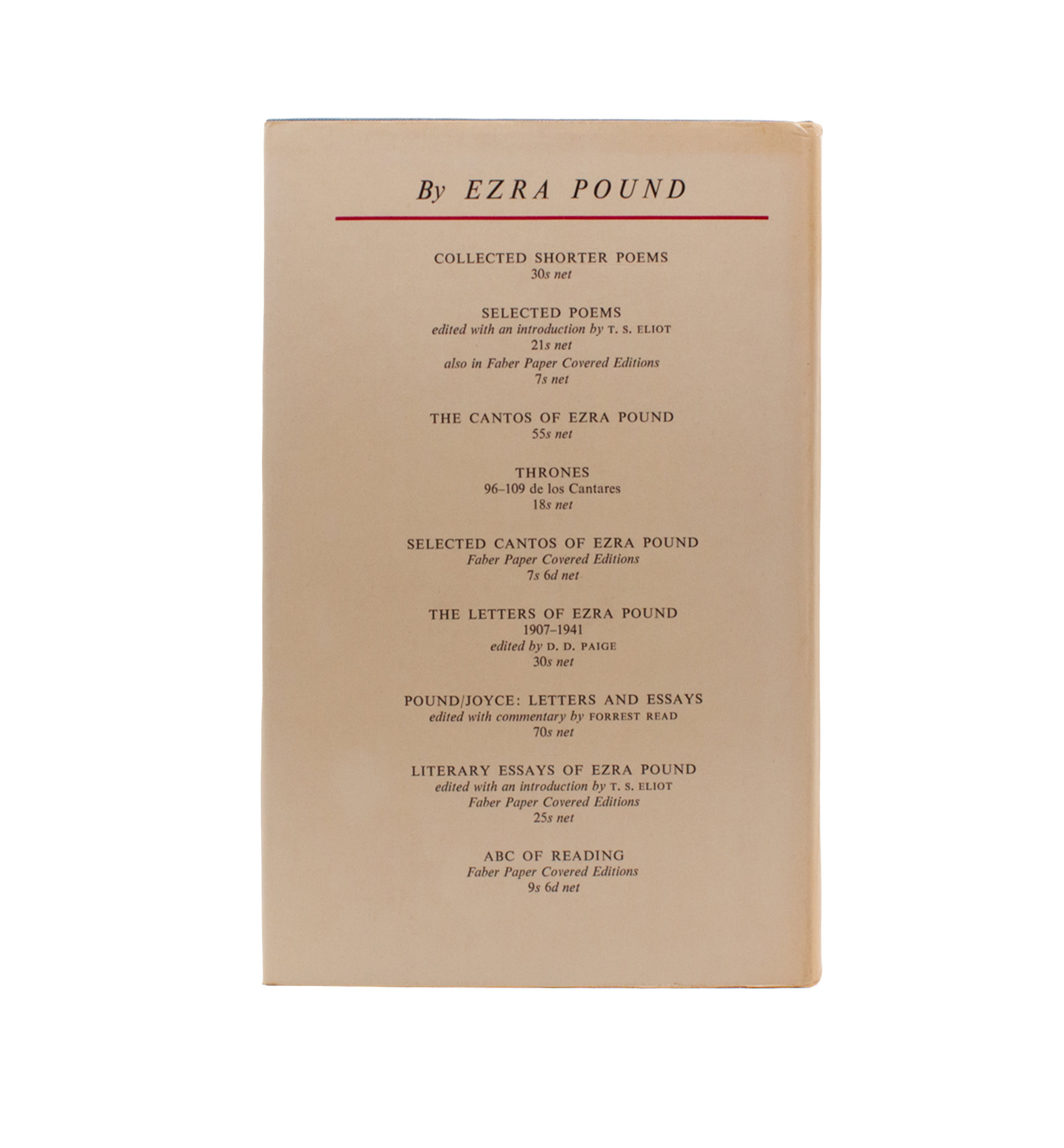 406pp.; 22.3 x 14.2 cm. Blue cloth boards lettered in gold on spine. White dust-jacket printed in black and red with a photograph of Pound by Lisetta Carmi-Genova to front.