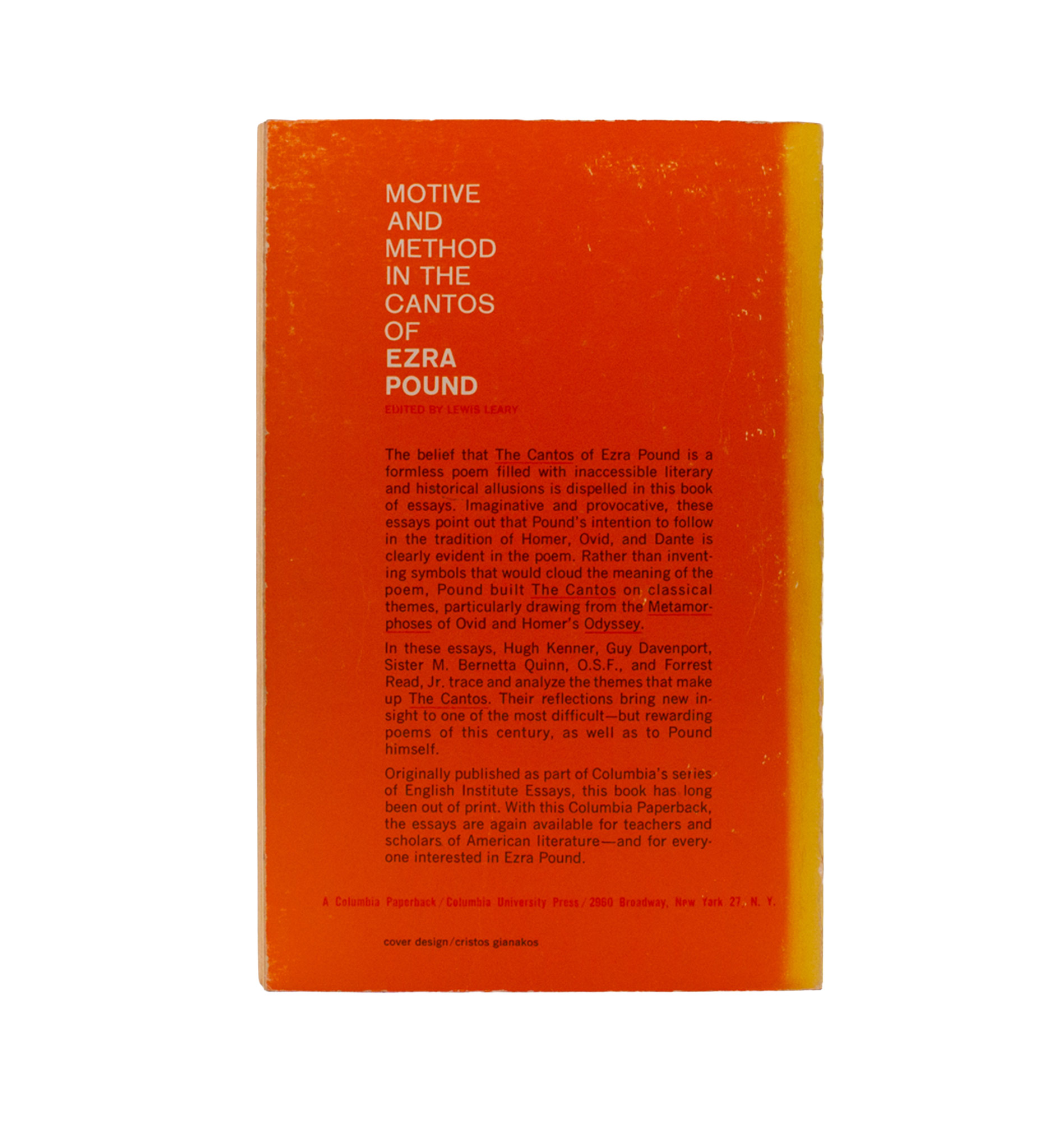 Contents: Eva Hesse, “Introduction”; Richard Ellmann, “Ez and Old Billyum”; N. Christoph De Nagy, “Pound and Browning”; Forrest Read, “Pound, Joyce, and Flaubert: The Odysseans”; Guy Davenport, “Persephone’s Ezra”; Boris de Rachewiltz, “Pagan and Magic Elements in Ezra Pound’s Works”; Donald Davie, “The Poet as Sculptor”; J. P. Sullivan, “Ezra Pound and the Classics”; Christine Brooke-Rose, “Lay me by Aurelie: An Examination of Pound’s Use of Historical and Semi-Historical Sources”; George Dekker, “Myth and Metamorphosis: Two Aspects of Myth in The Cantos”; Walter Baumann, “Secretary of Nature, J. Heydon”; John Espey, “The Inheritance of Tò Kalón”; Hugh Kenner, “Blood for the Ghosts”; Albert Cook, “Rhythm and Person in The Cantos”; Leslie Fiedler, “Traitor or Laureate: The Two Trials of the Poet.”