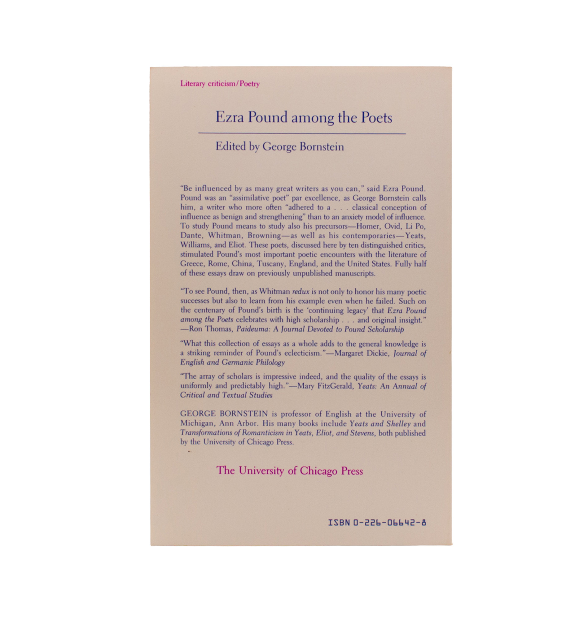 Contents: George Bornstein, “Introduction”; Hugh Kenner, “Pound and Homer”; Lillian Feder, “Pound and Ovid”; Ronald Bush, “Pound and Li Po: What Becomes a Man”; Stuart Y. McDougal, “Dreaming a Renaissance: Pound’s Dantean Inheritance”; Hugh Witemeyer, “Clothing the American Adam: Pound’s Tailoring of Walt Whitman”; George Bornstein, “Pound’s Parleyings with Robert Browning”; A. Walton Litz, “Pound and Yeats: The Road to Stone Cottage”; Thomas Parkinson, “Pound and Williams”; Robert Langbaum, “Pound and Eliot”; Marjorie Perloff, “The Contemporary of Our Grandchildren: Pound’s Influence.”